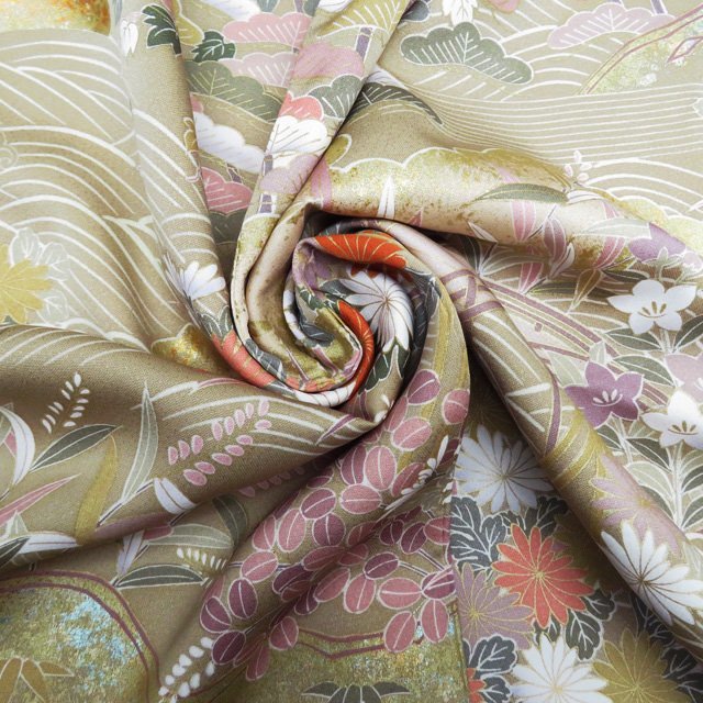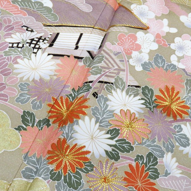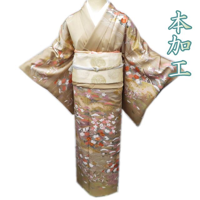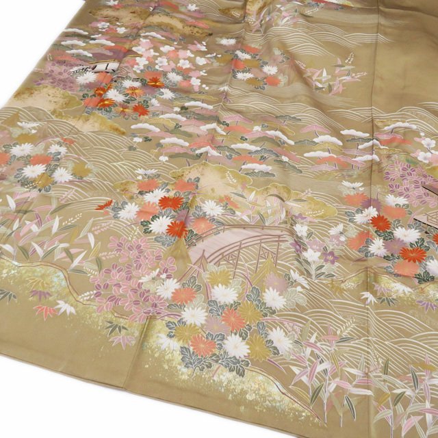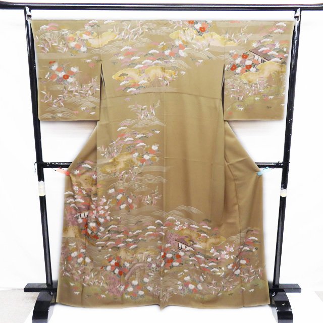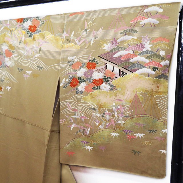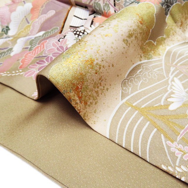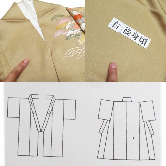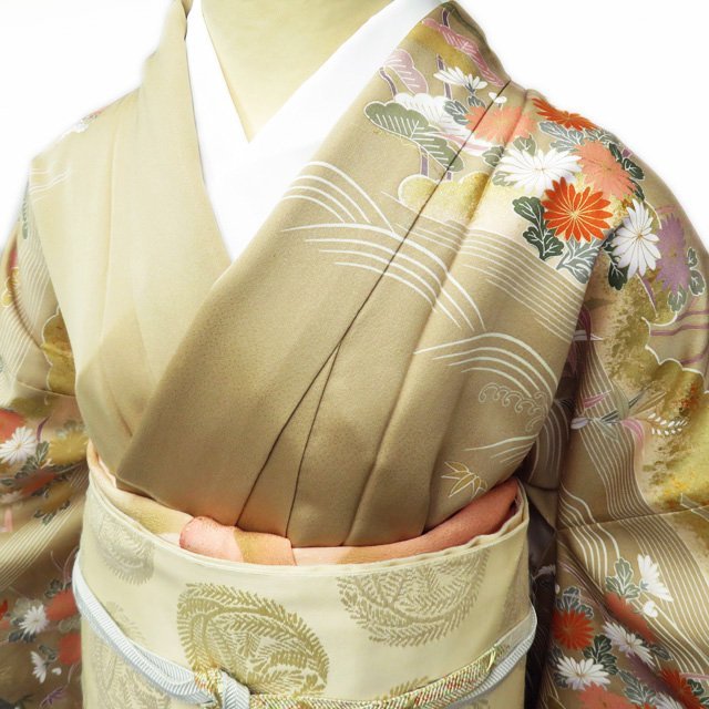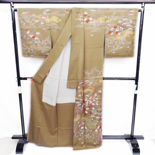 丈167cm(+6) 裄68cm(+1.5) 袖丈53cm(+3) 前幅25.5cm 後幅30cm ※サイズのお直し、承ります。 (身丈のみ、身幅のみのお直しは承っておりません) ※身丈は肩から測っております。 ※()内はおおよそのお直しいただける長さです。胴裏の長さ等によって()内の長さ通りお直しできない場合があります。 単位:cm 素材 正絹 商品ランク C ●着用時期 10月~5月(+-2週間) ●着用シーン 披露宴、パーティー、お出掛け、式典など ●お色 茅色 多色 金 襟と右後身に薄シミがございますが、目立たない程度でまだまだご着用いただけるお品物です。 写真に写っている着物のみの販売で帯等の付属品はついておりません。 一部商品は実店舗・他サイトでも並行して販売しておりますので売り切れの際はご了承ください。 その他多数販売中 gaga- | ||||||