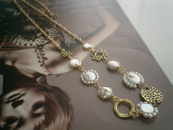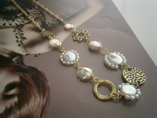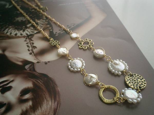 秋色・デッサン・・シリーズです♪完全パール主義・・フレンチ・モダンな淡水パールのネックレスです♪10ミリから12ミリまでの淡水パールのコインにワイヤーや3ミリ位の小粒のパールでおめかししました♪お花やリングのデザインメタルを合わせてキュートな表情です♪長さは全長75センチ位で調節自由です♪長さを変えても素敵です♪お揃いのブレスレットも出品しています♪シンプルで合わせやすいデザインを考えて作りました♪ハンドメイドをご理解いただいてノーリターン、ノークレームでお願いします♪