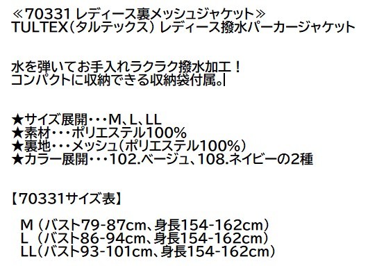 [ゆうパケット/1枚]◆アイトス 70331婦人用薄手パーカー【108ネイビー・Lサイズ】フード付・裏メッシュ・撥水加工の品を、即決1280円♪