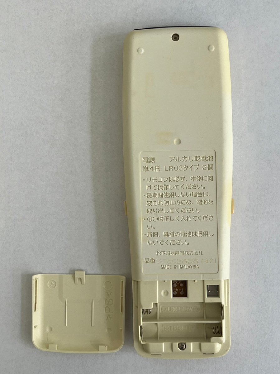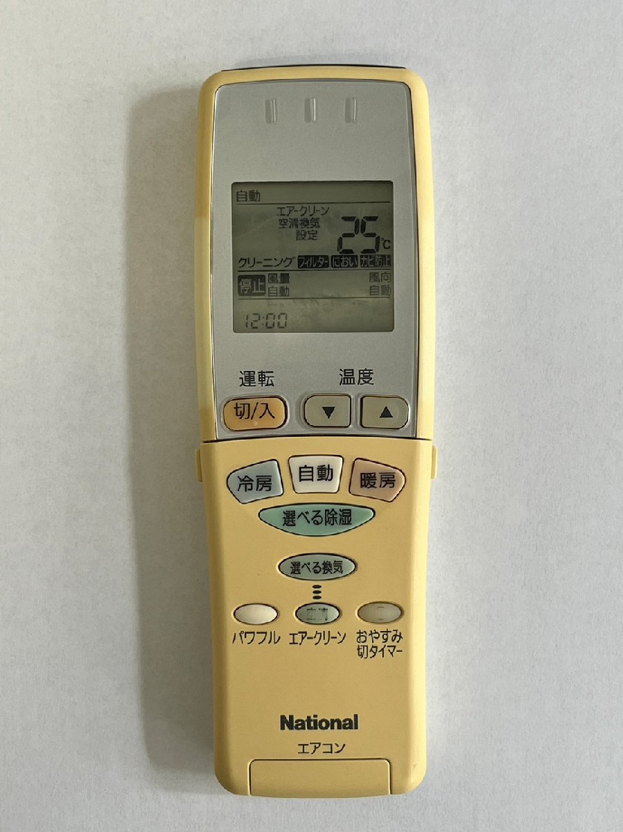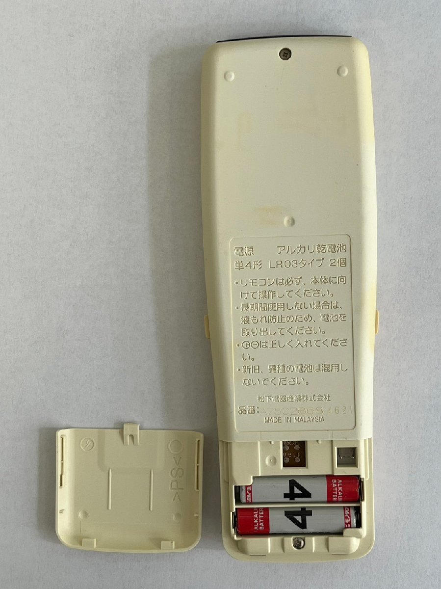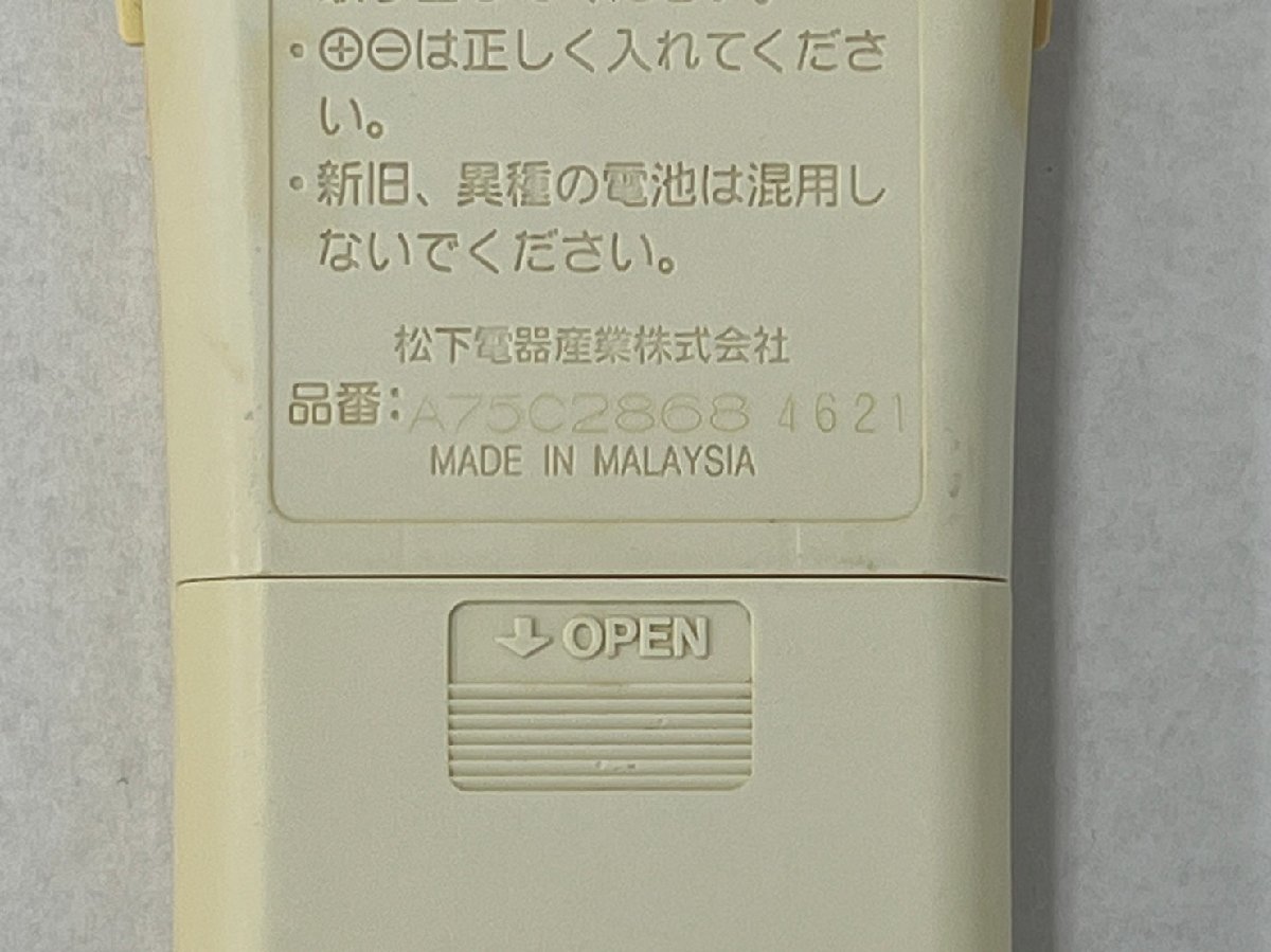 【National A75C2868 電池付き】リモコンのみの販売です。赤外線チェック済/クリーニング済。年による色あせや目立ったキズ、エアークリーンやおやすみ切タイマーのボタンが剥げて少し不鮮明になっておりますが、動作に支障はございません。電池を入れて到着したらすぐ使えるようにしてお送りします。電池は接触しないように紙を挟んでおりますので、到着したら引き抜いてからご利用ください。電池や設定の問題を解決し、使用できるようになっています。使用できない場合は到着後3日以内にまずストアにご相談をお願いします。設定の問題、対応機種間違い、本体側の問題等、商品説明に書いてある不良を除き保証対象外です。対応機種についてのご質問はお答えできかねます。各メーカーへお問い合わせいただくか、取扱説明書をご確認ください。中古リモコンは現品限りとなりますので、ご希望の商品がございましたらお早めにご購入ください。※他店でもこちらと同じ中古リモコンを販売しております。そのため他店でお客様より先に購入があった際は、大変申し訳ございませんがご購入いただいた商品はキャンセルとさせていただきます。あらかじめご承知ください。