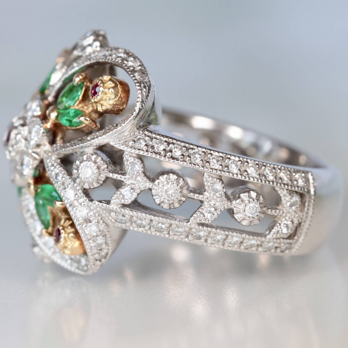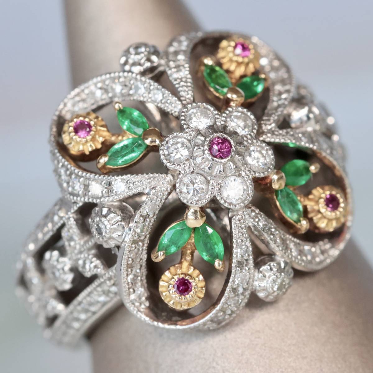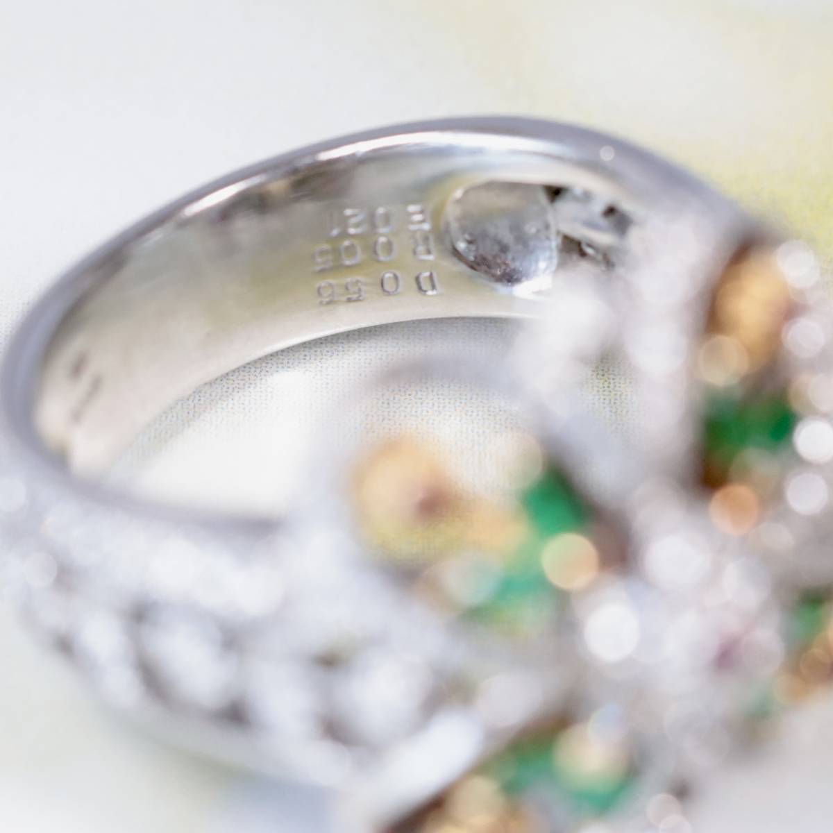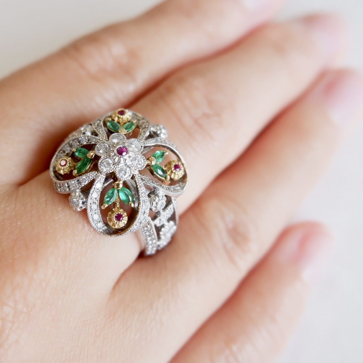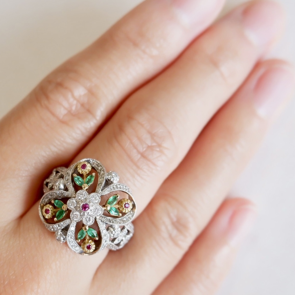 プラチナ枠に丁寧にセッティングされたダイヤモンド、目を惹くエメラルドとルビーの組み合わせも品良くまとまっています。