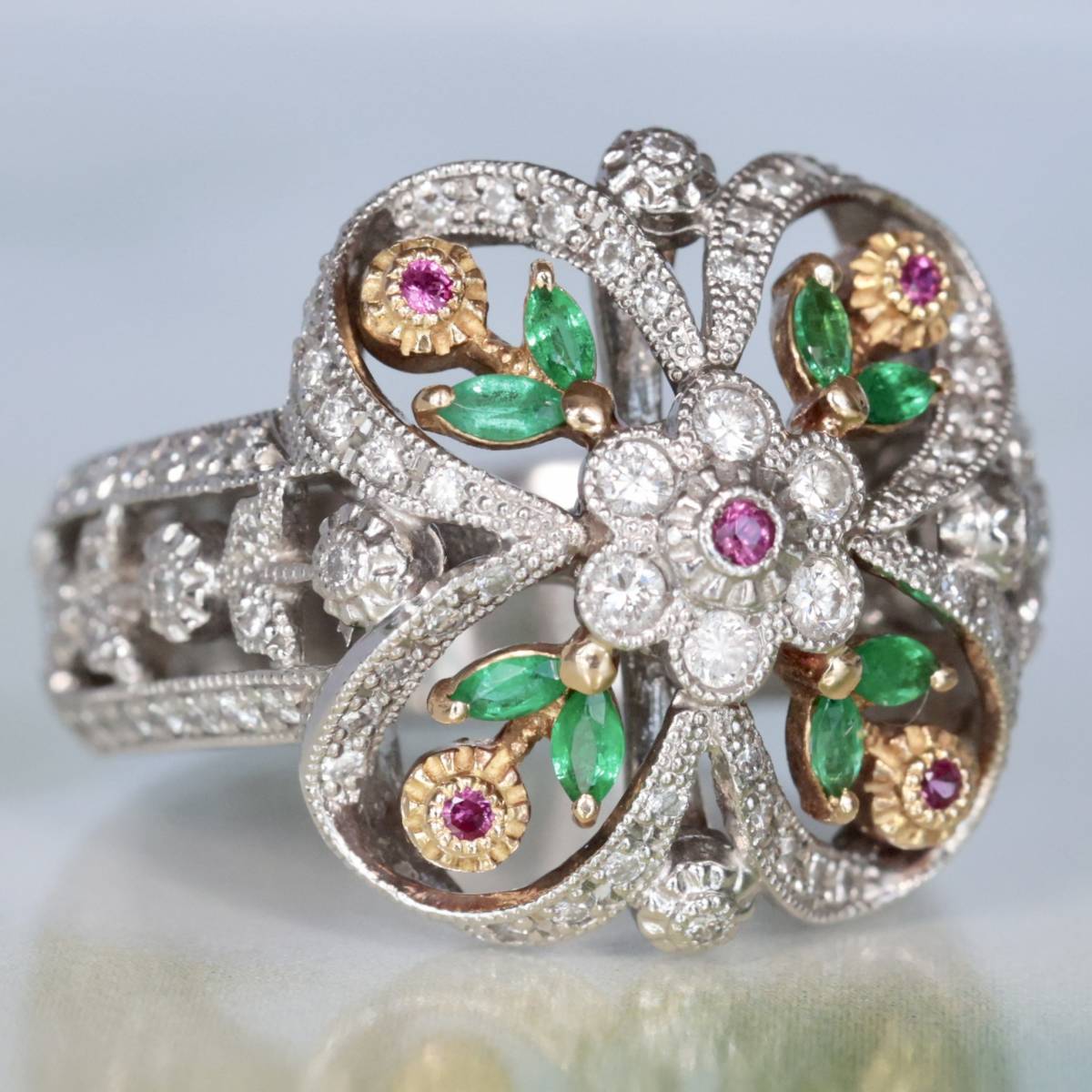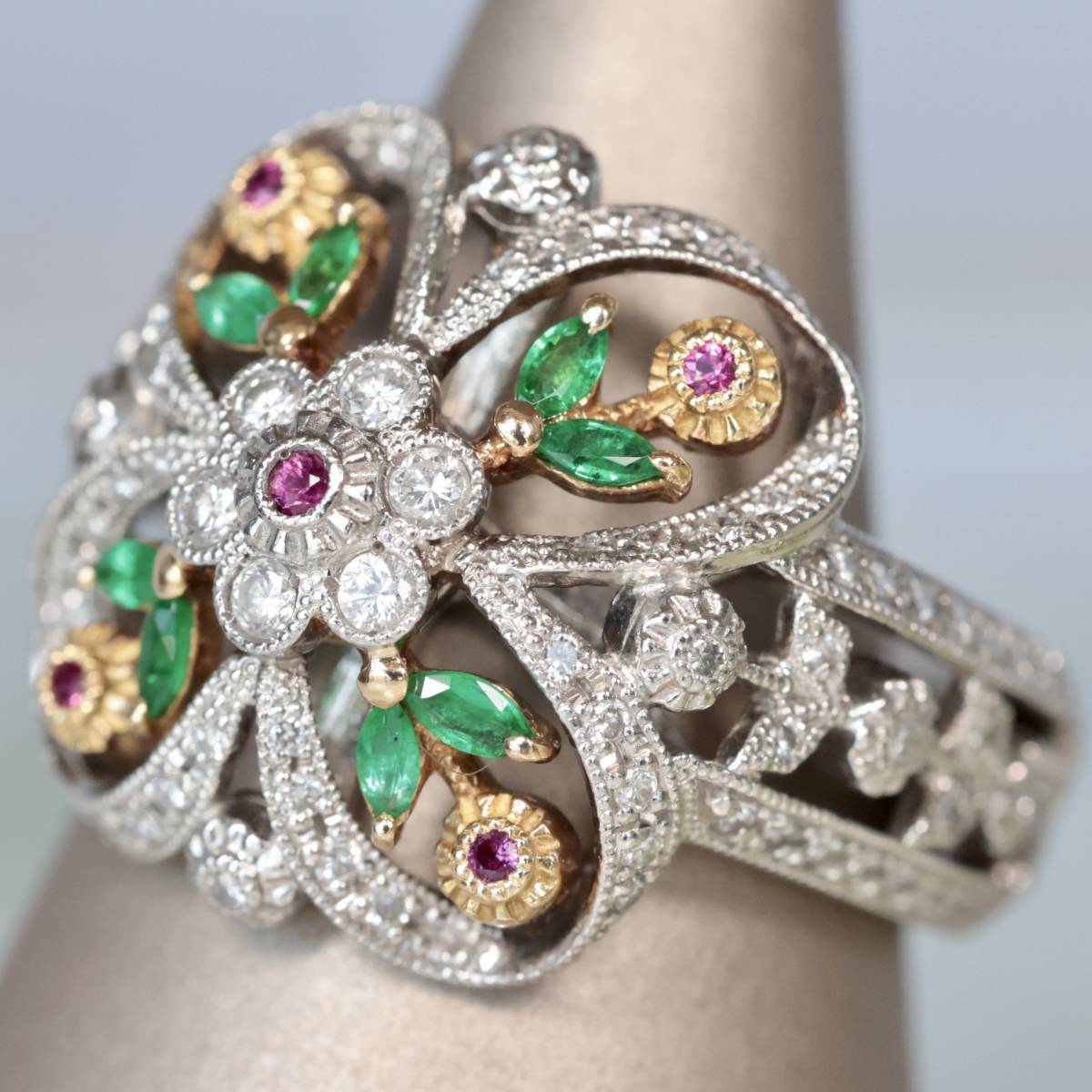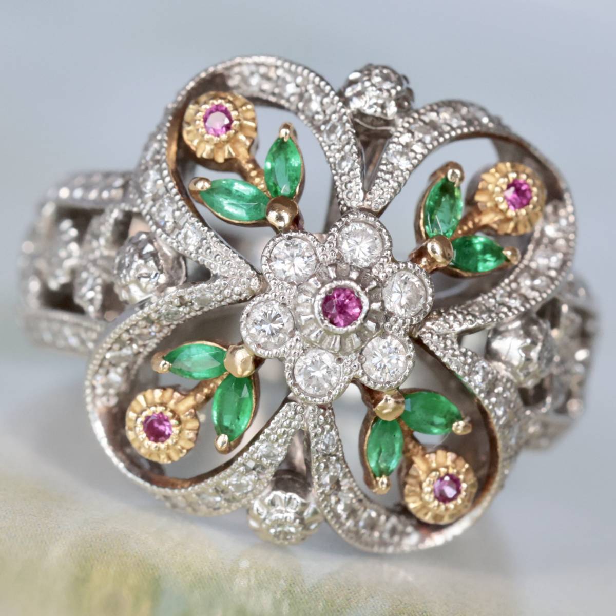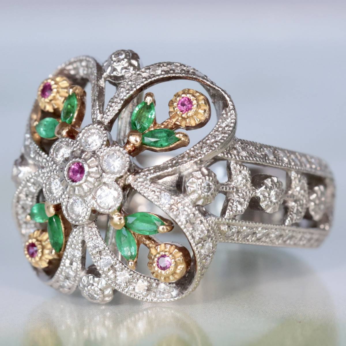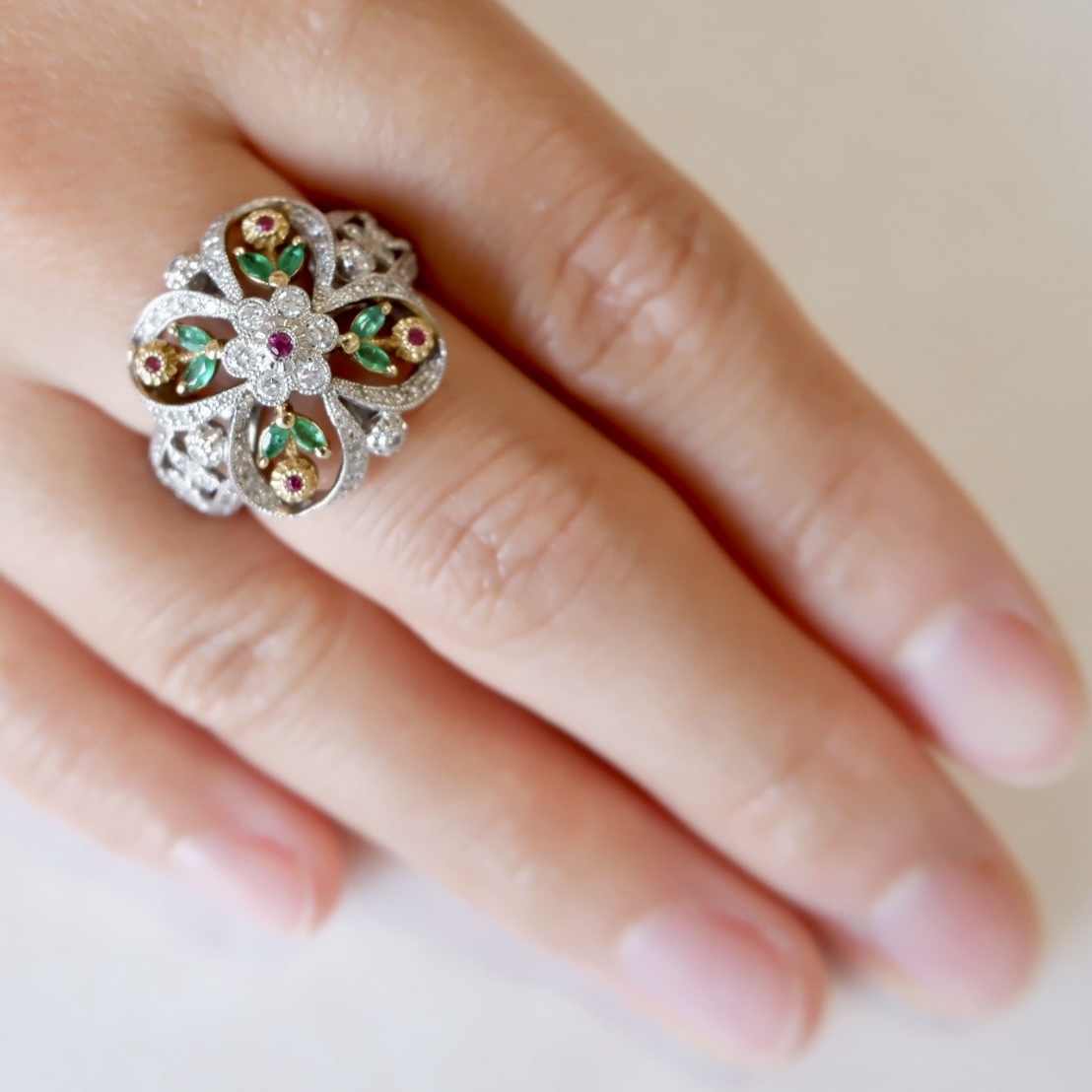 プラチナ枠に丁寧にセッティングされたダイヤモンド、目を惹くエメラルドとルビーの組み合わせも品良くまとまっています。