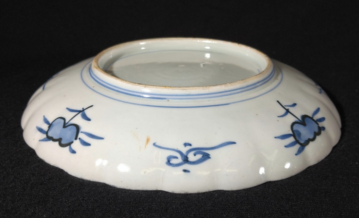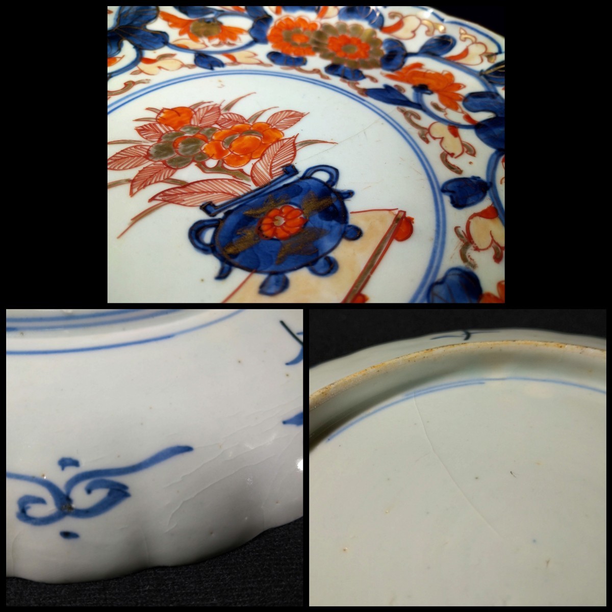 重厚感と華やかさを併せ持つ美しい輪花中皿でございます。全体的に良好なコンディションでございますが、ニュウがございます。素人採寸で申し訳ございませんが、径22.0cm、高さ3.8cmでございます。