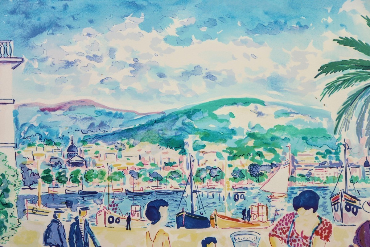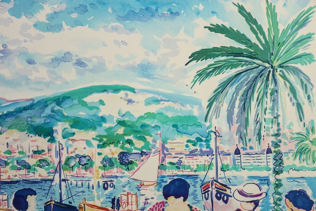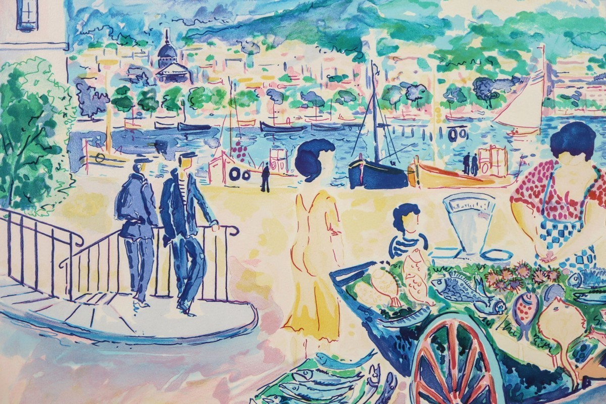 真作 ジャン・クロード・ピコ リトグラフ「コートダジュールの広場」画寸 51cm×41cm 仏人作家 南仏、風光明媚な保養地の爽やかな港町 8007