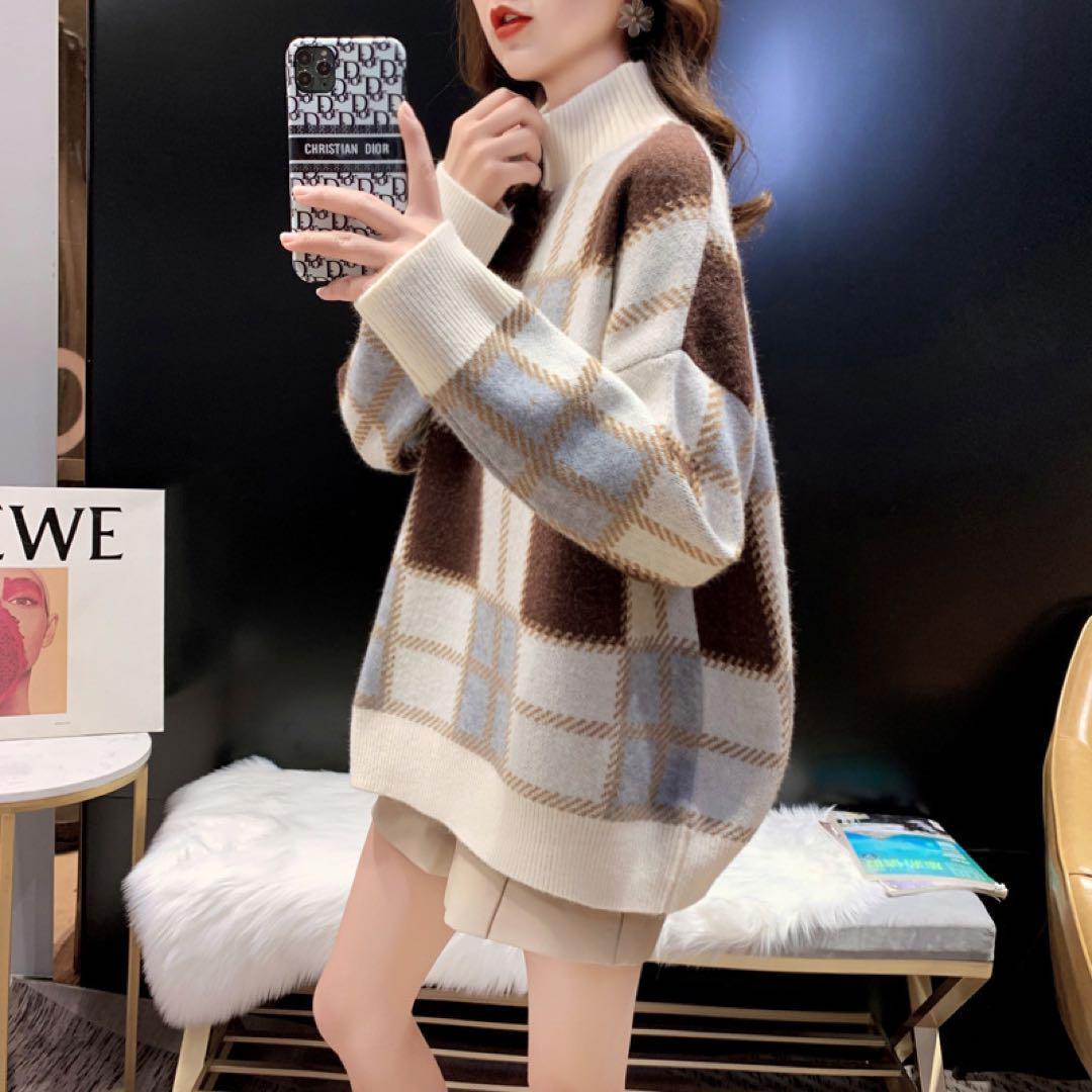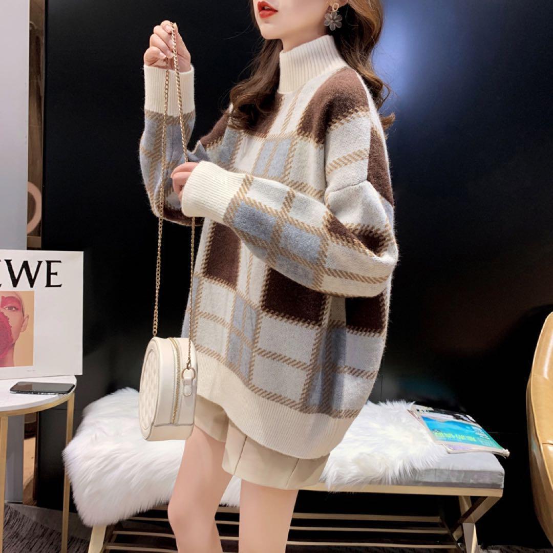 モックネック チェック ニット セーター トップス ハイネック 韓国 オルチャン レディース