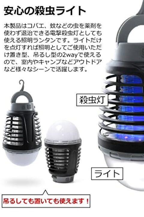 電撃殺虫灯として、照明ランタンとして幅広く活躍する便利なライト♪ 本製品は、コバエ、蚊などの虫を薬剤を使わず退治できるお子様のいる家庭にも安心のアイテムです。また、ライトだけを点灯すれば照明としてご使用いただけ、置き型、吊るし方2wayで使えるので、室内やキャンプなどアウトドアシーンなど様々なシーンで活躍します。