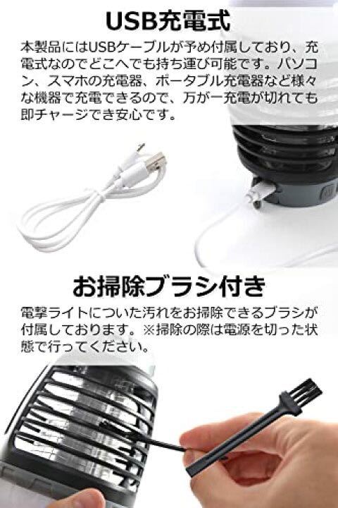 こだわりのポイントがたくさん詰まった使い勝手の良いライトです♪ 「持ち運びしやすいコンパクトデザイン」吊り下げのフックが綺麗に収まりスタイリッシュに収納可能。「電撃スイッチ/照明」電撃スイッチ、照明スイッチが一目で分かるので、切り替えが簡単です。「安全カバー」 指などが当たらないように安全カバーが付いています。「お掃除ブラシ付き」電撃ライトについた汚れをお掃除できるブラシが付属しております。