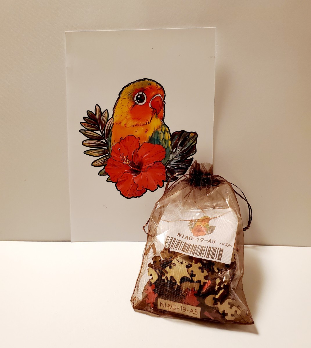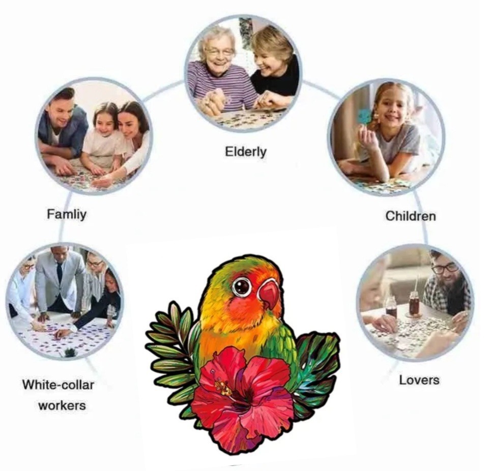 木製のジグソーパズルは、動物や植物のような形をした小さなピースでできています。