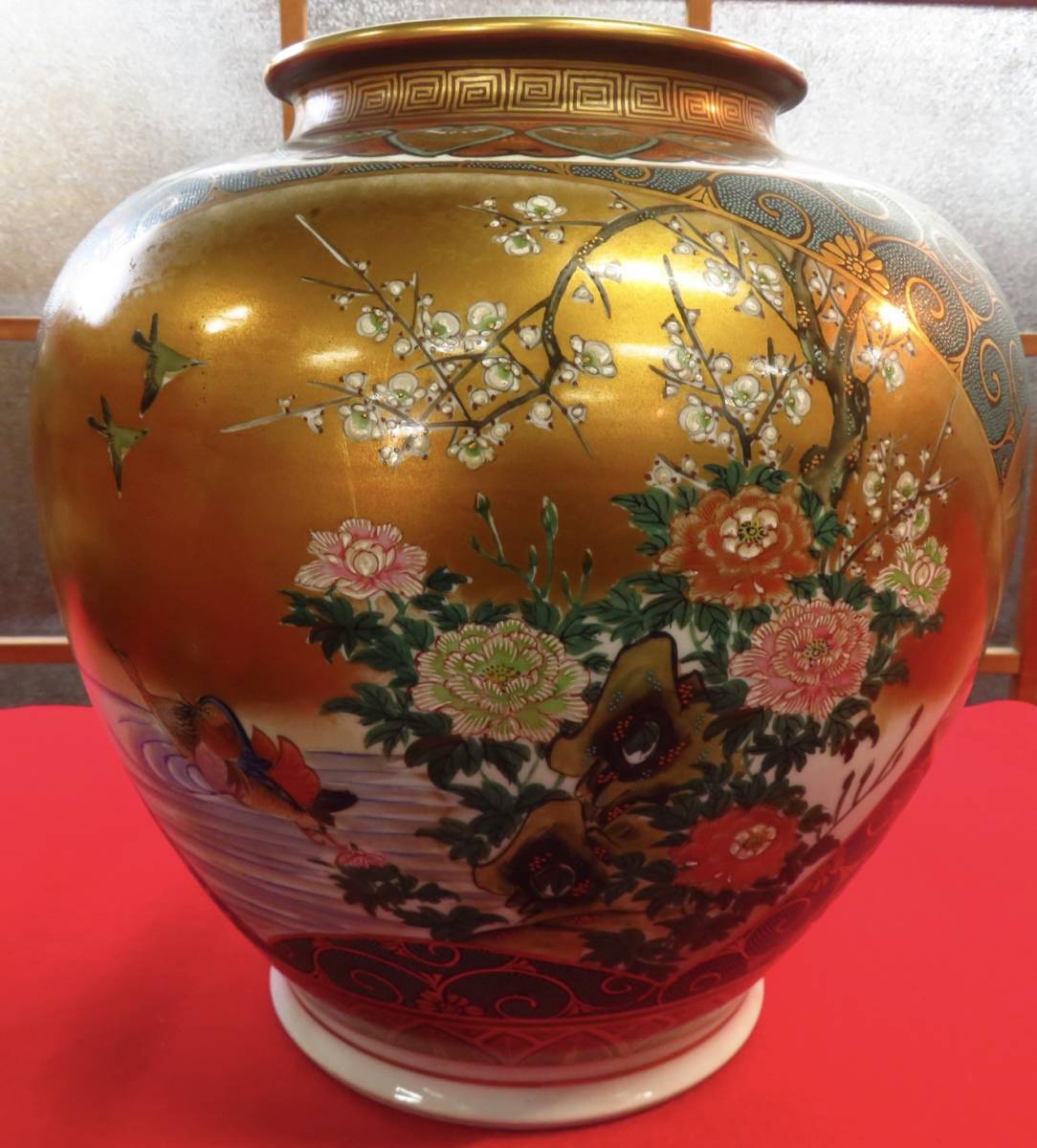 | 九谷焼 龍山 金彩色絵青粒山水風景人物図花瓶 飾壺 壷 細密絵付 花器 花入 骨董品 古美術品 在銘 直径31cm | ||