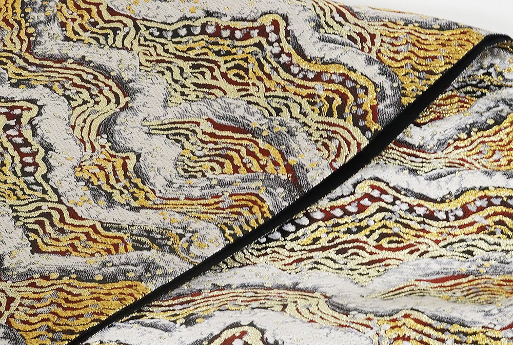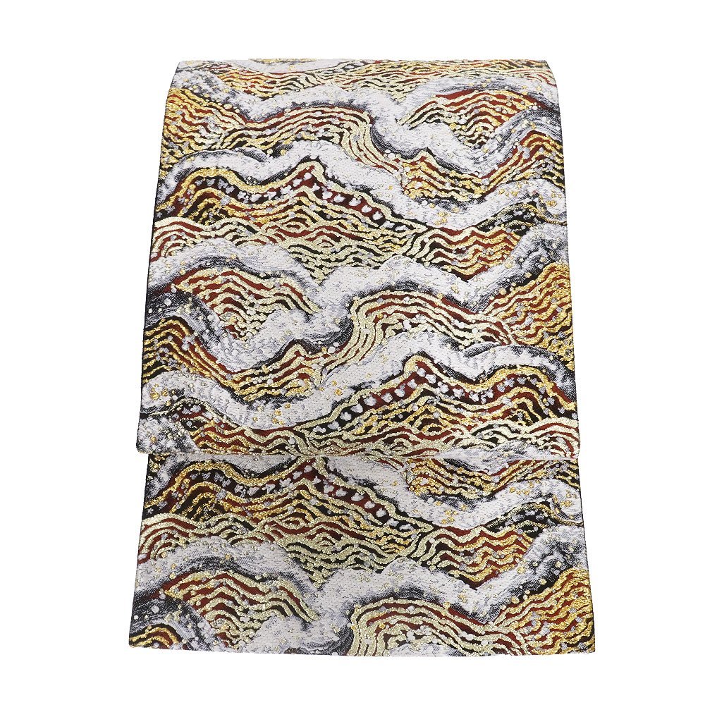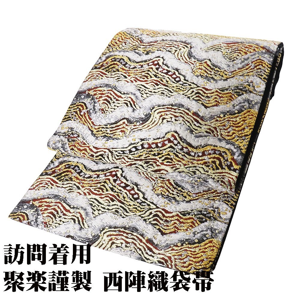 | 聚楽謹製 西陣織袋帯 黒・薄グレー・金・赤地 波 落款入り 新品 仕立て上がり |