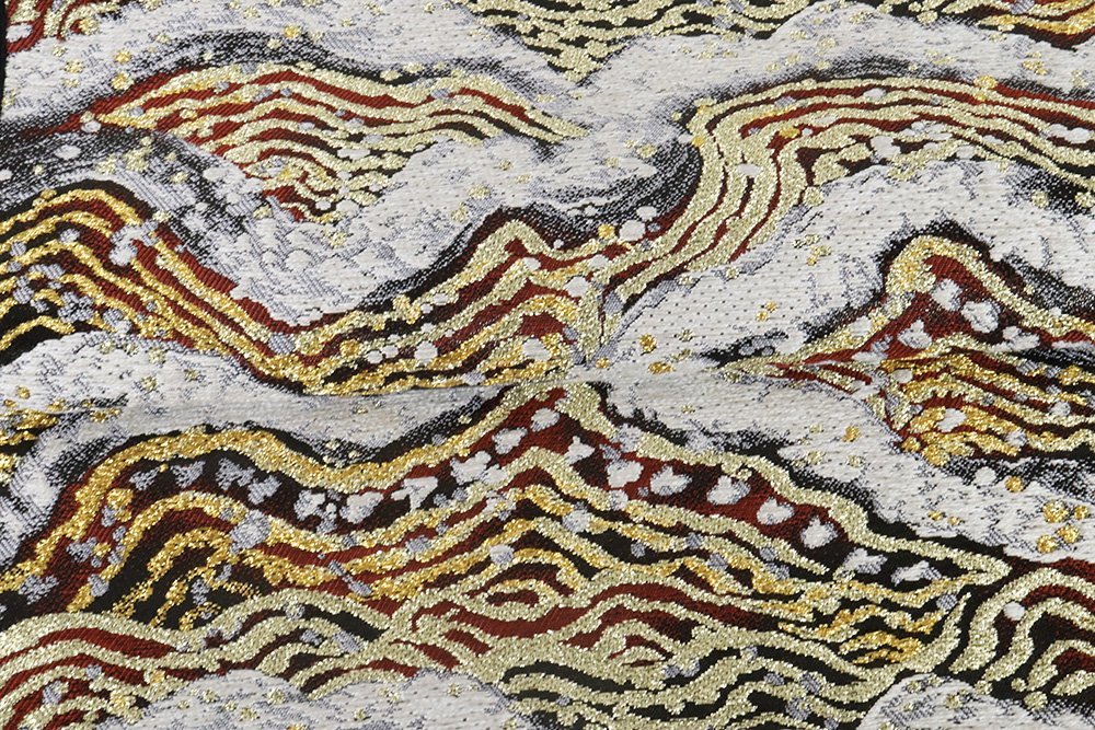 聚楽謹製 西陣織袋帯 黒・薄グレー・金・赤地 波 (写真では上手く色が出ない場合があります。ご了承下さい) ※お使いのディスプレイの種類や設定の差により 実物の色と画像の色が少々異なることもございます。 写真の枚数が多いので一度パソコンでご覧ください。 |
