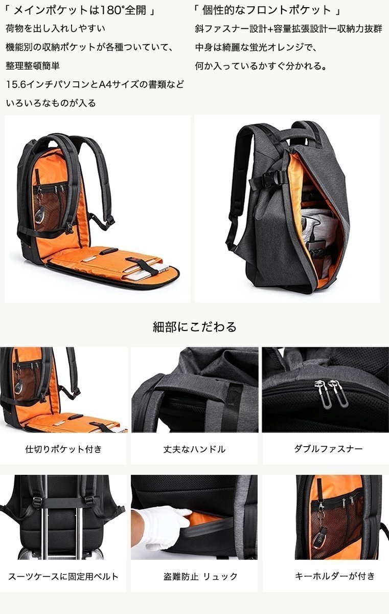 【ビジネスリュック メンズ】ファッション設計で、実用性も高いリュックサックです。バックパックの中身は綺麗な蛍光オレンジで、何か入っているかすぐ分かる。背面ポケットは180°広がり、荷物が一目瞭然で把握できる。ビジネスはもちろん、通勤も通学も、自転車やバイクのサイクリング・ツーリング・山登りなどのアウトドア活動にもおすすめ。