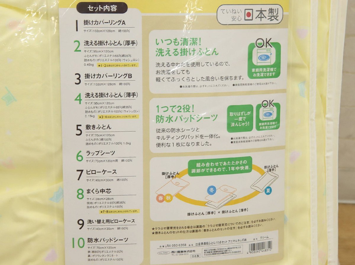 【品名】 西川 出産準備 組ふとん 10点セット アニマル柄 クリーム色 【コンディション】 傷や汚れ等がある場合がございます。 匂いも無く、綺麗な状態です。 商品は現状渡しとなります。 【サイズ・仕様】 メーカー 西川 掛けカバーリングA 洗える掛け布団(厚手) 掛けカバーリングB 洗える掛け布団(薄手) 敷きふとんサイズ 幅70cm×長さ120cm 詰め物重量1.6kg ラップシーツ ピローケース まくら中芯 洗い替え用ピローケース 防水パッドシーツ 付属品・パーツなどは写真にある物が全てです。 *商品のトラブル等で、返金手続きとなった場合、 お支払い頂いた商品代金以上の返金は致しませんので、 ご承知ください。 |