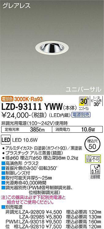 大光電機 LED ユニバーサル ダウンライト 電球色 埋込穴50 「LZD-93111YW」 + 「LZA-93018」