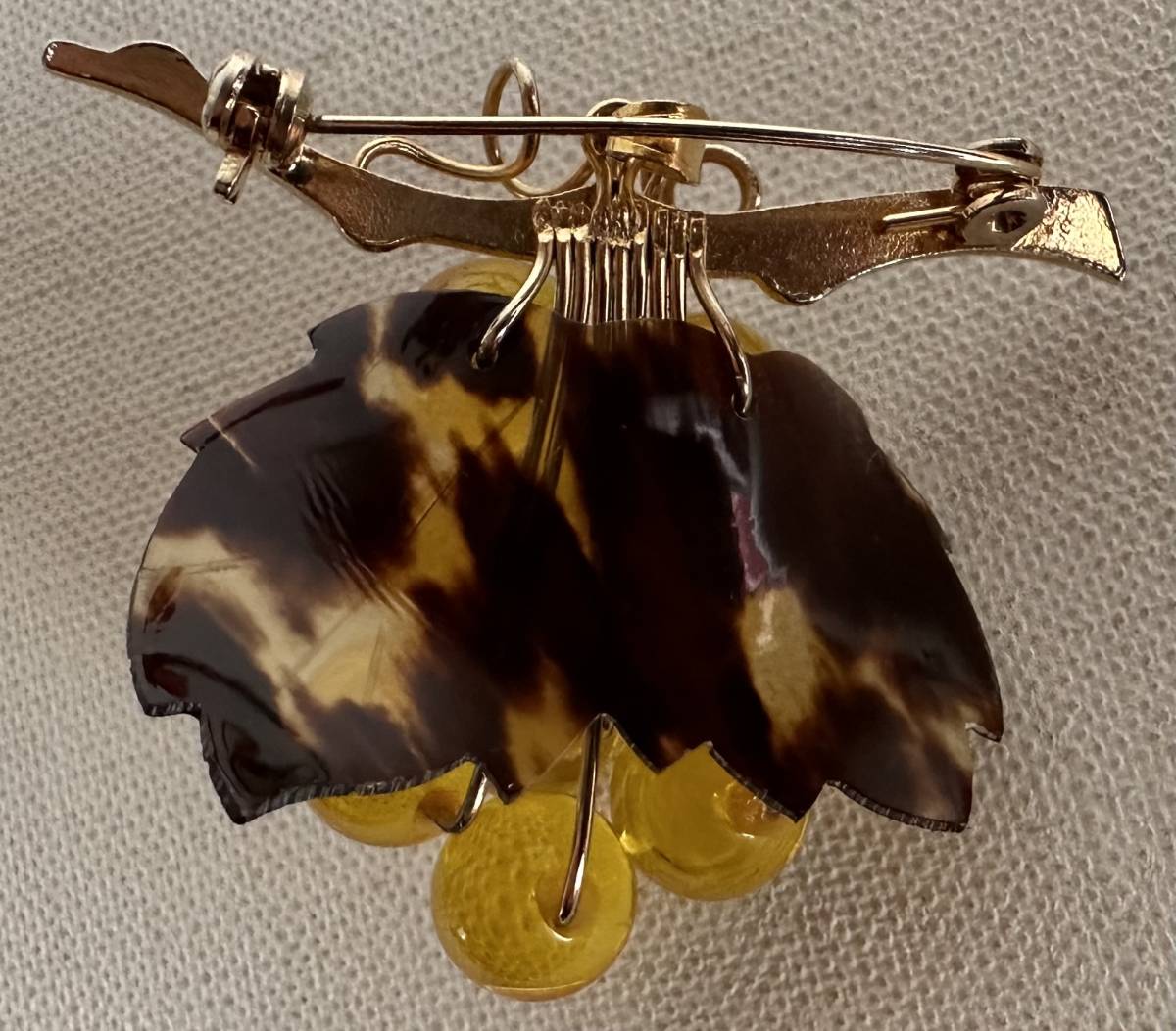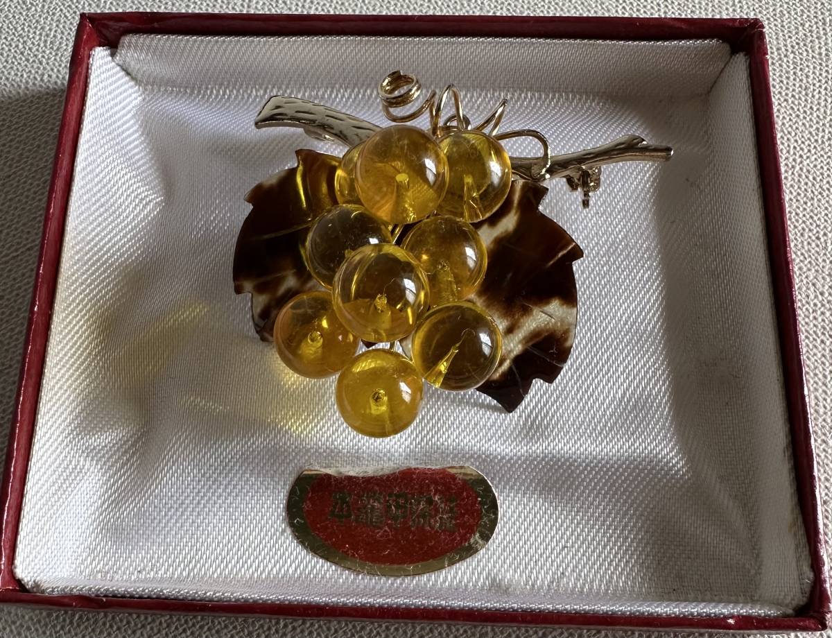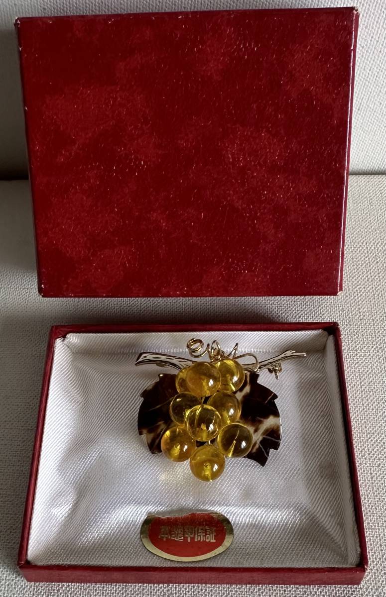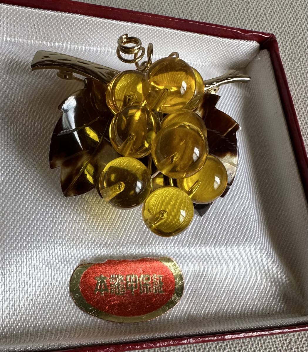 本鼈甲保証 葡萄モチーフブローチ 美品です。サイズ:全長5cm。全幅4cm。葡萄モチーフのブローチは葉の部分が本鼈甲素材であると思います。画像にてご判断願います。箱付。ご理解頂ける方のみノークレーム・ノーリターンでお願いします。