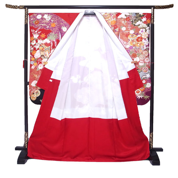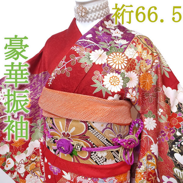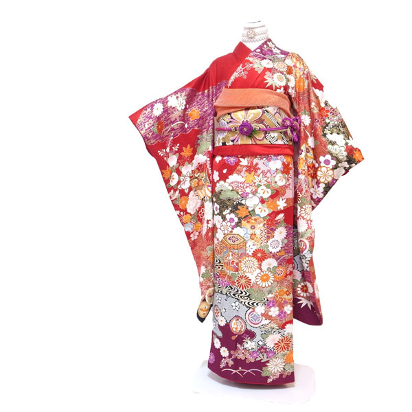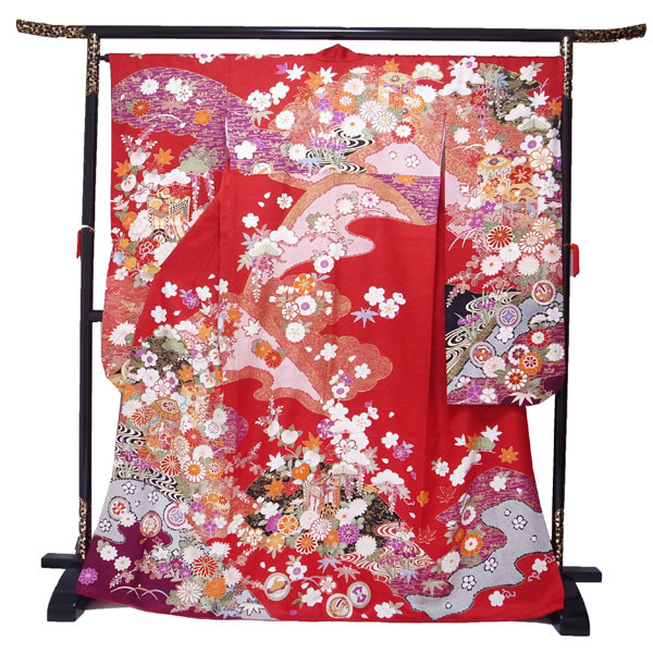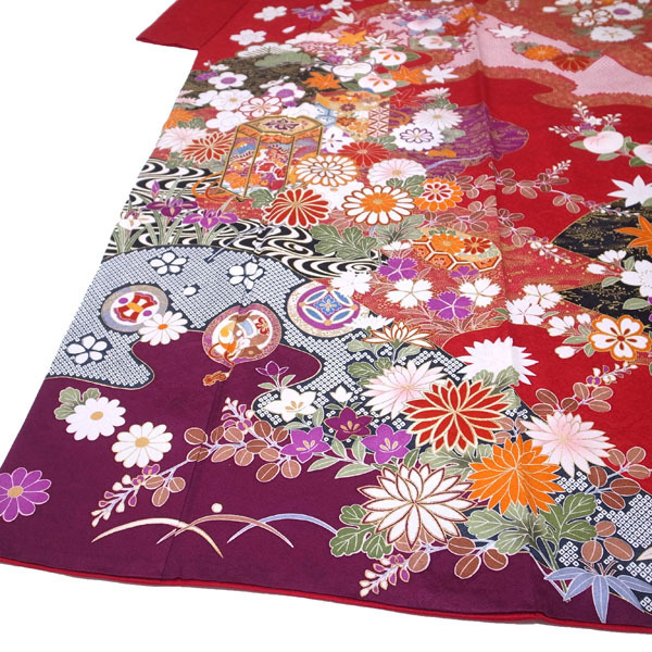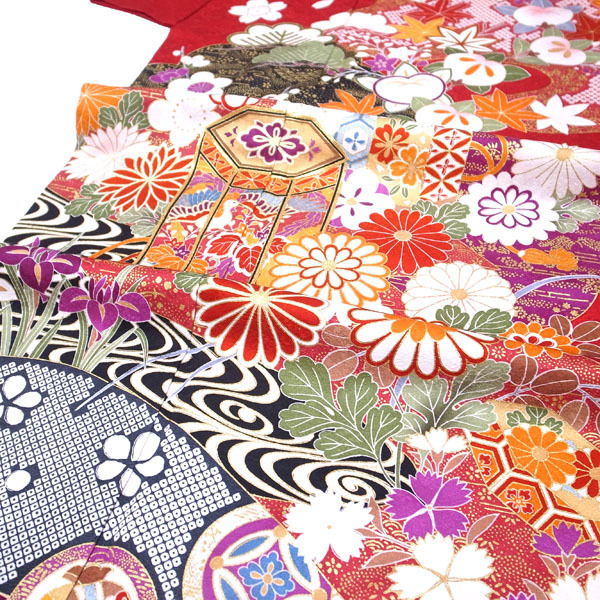 振袖 着物 袷 赤 レッド 金彩加工 金駒刺繍 地紋 貝桶 松竹梅 菊 桜 橘 楓 桔梗 撫子 花菖蒲 宝尽くし 四季の花 成人式 成人 結婚式 結婚 お祝い リユース リサイクル 正絹 絹 上質 オシャレ おしゃれ お洒落 レディース 女性 女物 女 和服 和装 なごみ 身丈167.5 裄66.5 Lサイズ 中古 仕立て上がり品 sn1042