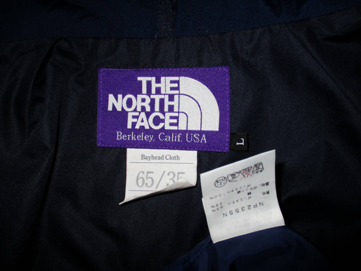 美品★ノースフェイス パープルレーベル ナナミカ 65/35 マウンテンパーカー NP2355N 紺 サイズ Lです。 株)ゴールドウイン製の正規品です。素材は表地 ポリエステル65、綿35です。裏地はポリエステル100です。色はネイビーです。色は画像でご判断ください。