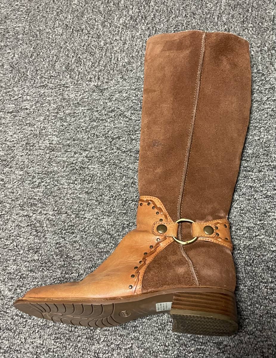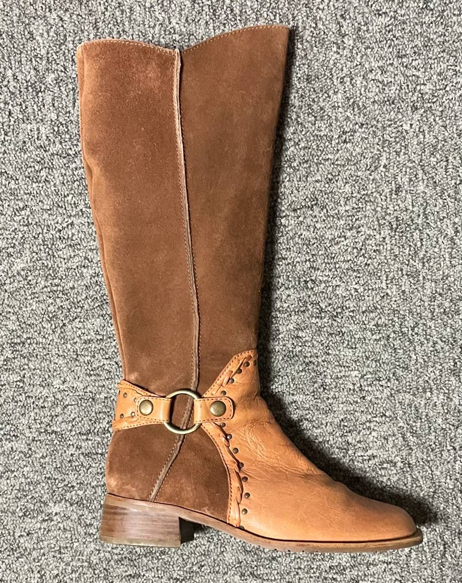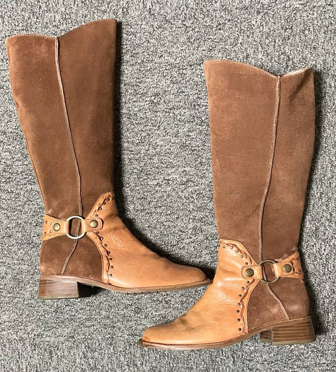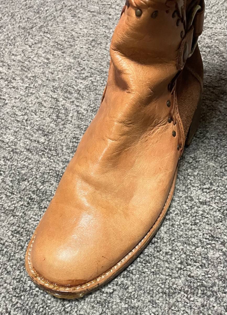 左のつま先部分に修理箇所があり、革の部分に少し接着剤がついています。左シャフトにごく薄い染みがございます。写真でご確認ください。