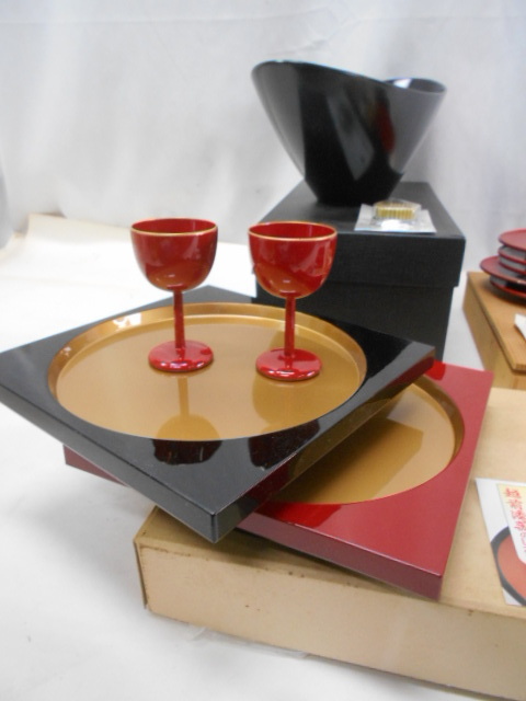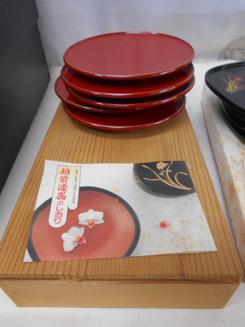 「真作」越前漆塗り製品4セットと蒼風黒花器1個 いろいろまとめて 花器 食器 会席道具 越前蔵うぶだしです。
