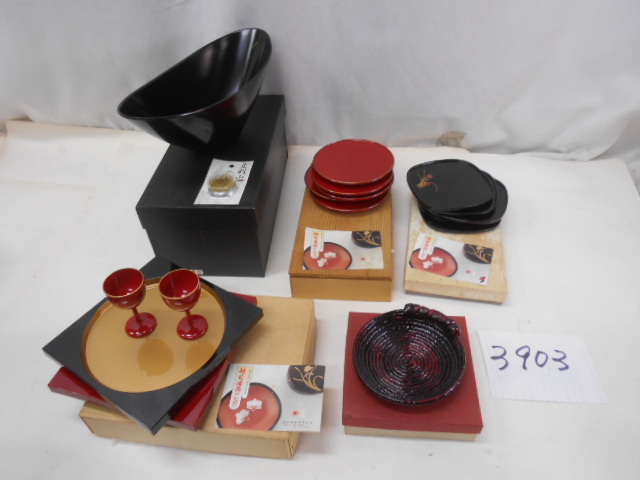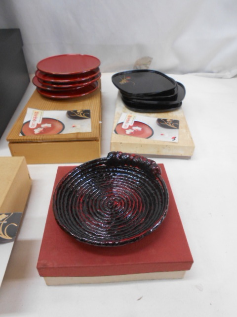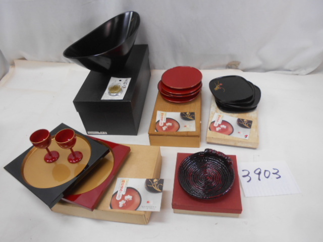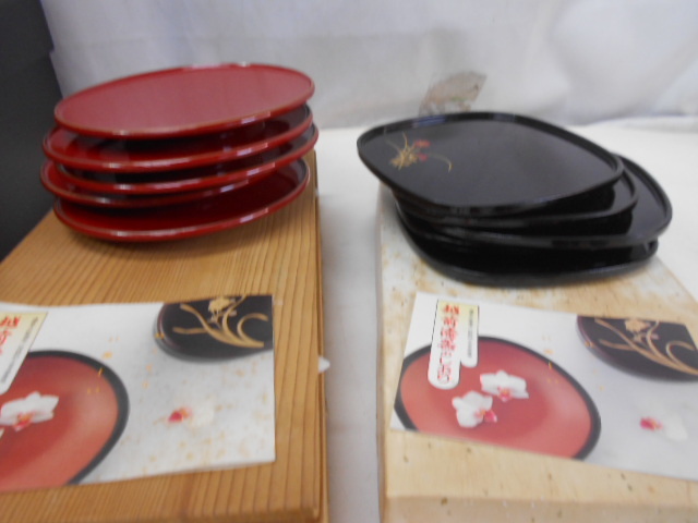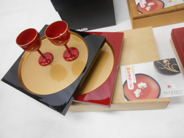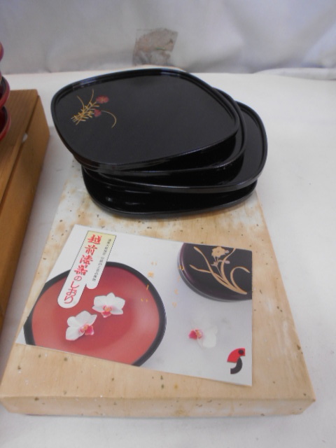 大雅堂3903 「真作」越前漆塗り製品4セットと蒼風黒花器1個 いろいろまとめて 花器 食器 会席道具 越前蔵うぶだし