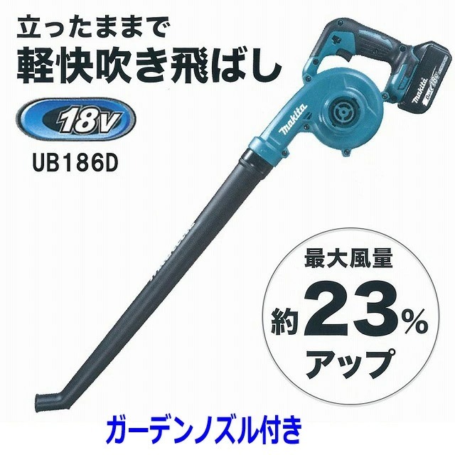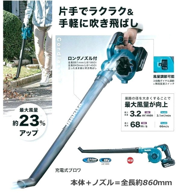 ■マキタ 18V 充電式ブロワ お庭のお掃除・吹き飛ばしなどに!★新品・未使用 ■マキタ 18V 充電式ブロワ UB186DZ 本体+バッテリーBL1860B+充電器DC18RF (ガーデンノズル仕様) ★新品・未使用 ★通常セットより使用時間が約2倍! 正規純正品ですのでご安心ください。 ★すぐに使える!18V6.0Ahバッテリー充電器セット! ★立ったままで軽快吹き飛ばし!落ち葉・ゴミの清掃に! ●ロングノズル付 ●風量調節可能(3段階ダイヤル調節+無段変速スイッチ) ●最大風量 0?3.2mm3/min ●最大風速 68(最大)・56(平均)m/s ●標準付属品:ガーデンノズル 【仕様】 ・風量(m3/min):0?3.2 ・風速(m/s):最大68、平均56 ・電源 18V ・本機寸法(長さ×幅×高さmm):861×156×210 ・質量 1.8kg(バッテリ含む) ・1充電あたりの作業量(目安)<風量> 「強」:約24分 「中」:約60分 「弱」:約160分 ・標準付属品 ガーデンノズル ※18V6.0AhバッテリーBL1860B 1個、充電器DC18RF 1台付きです。 ★この機会に是非!お買い上げください! |