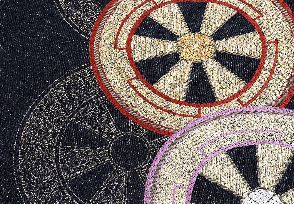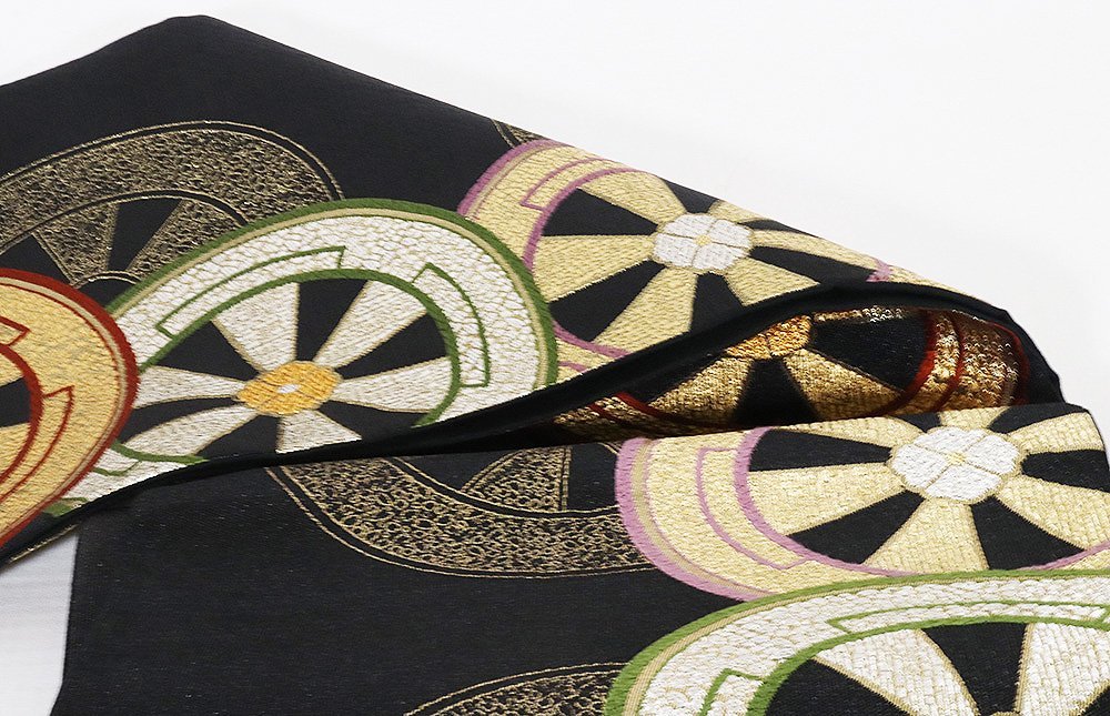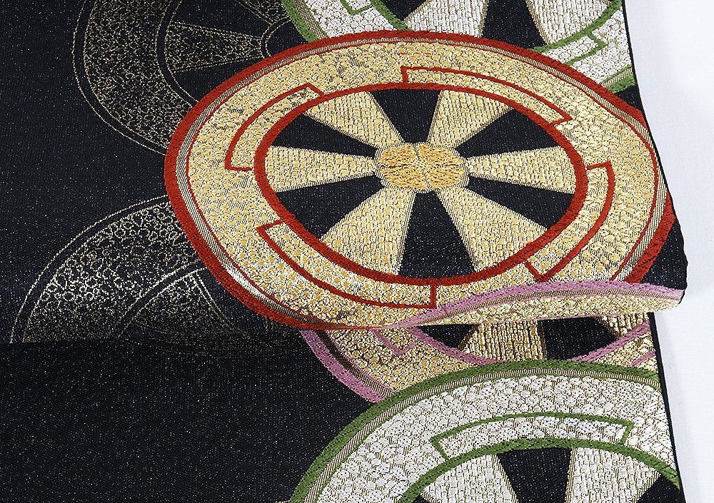 | 色・柄 | 西陣織袋帯 つづれ織 黒地 車輪文 (写真では上手く色が出ない場合があります。ご了承下さい) ※お使いのディスプレイの種類や設定の差により 実物の色と画像の色が少々異なることもございます。 写真の枚数が多いので一度パソコンでご覧ください。 |