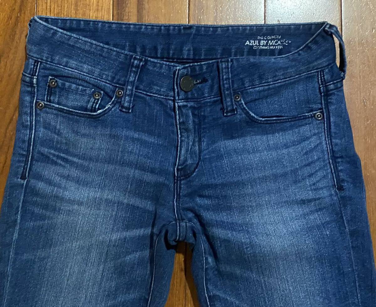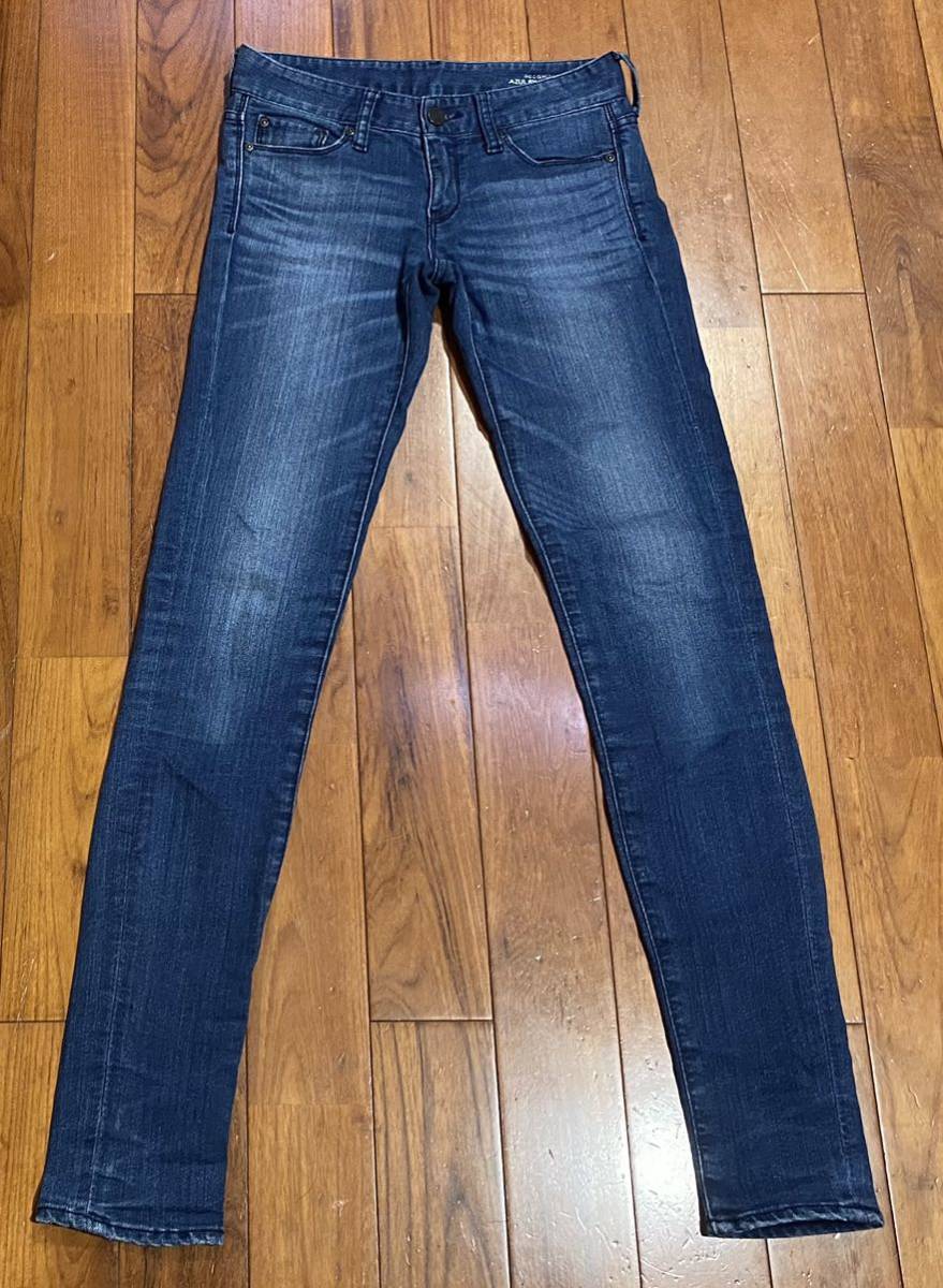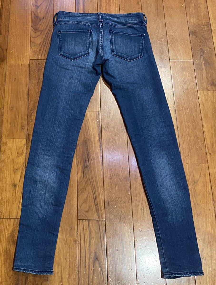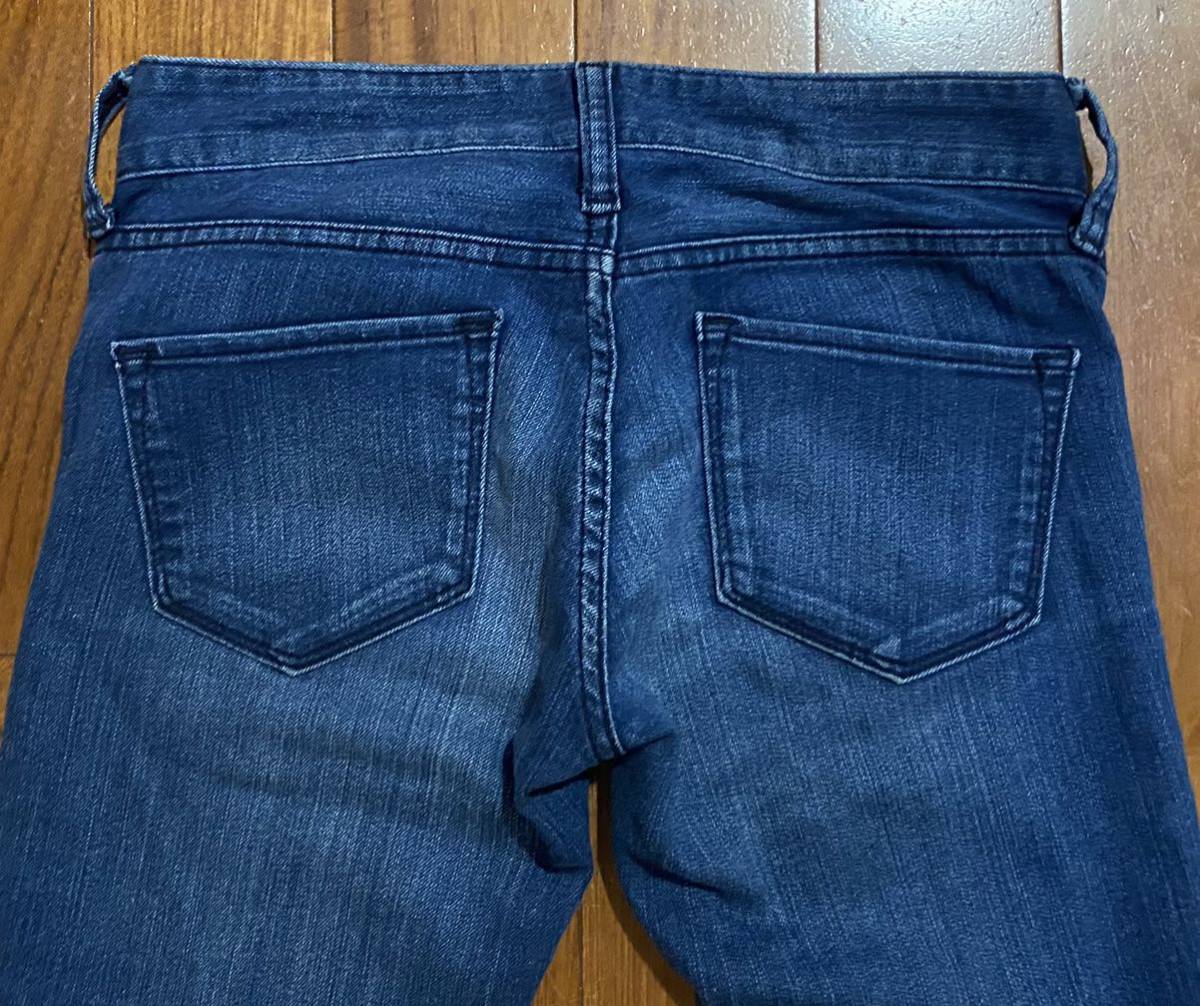 アズールバイマウジーのストレッチスキニーデニム(ジーンズ)、No.2506S612-0070です。色はインディゴブルーです。USEDですが状態は良いです(10段階中8程度)。生地はストレッチ入りでコットン76%、ポリエステル23%、ポリウレタン1%です。ジッパーフライ、裾はチェーンステッチです。正規品です((株)バロックジャパンリミテッド、中国製)。サイズはW23でウエストは重ねずに平置きで約70cm、ヒップ約86cm、股上約18cm、股下約81cm、股下15cmのふともも部分約42cm、裾まわり約25cm、重量約350gです。