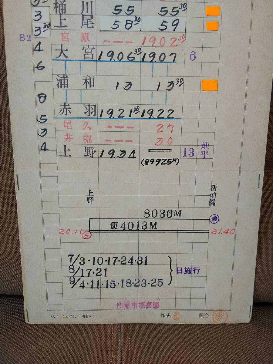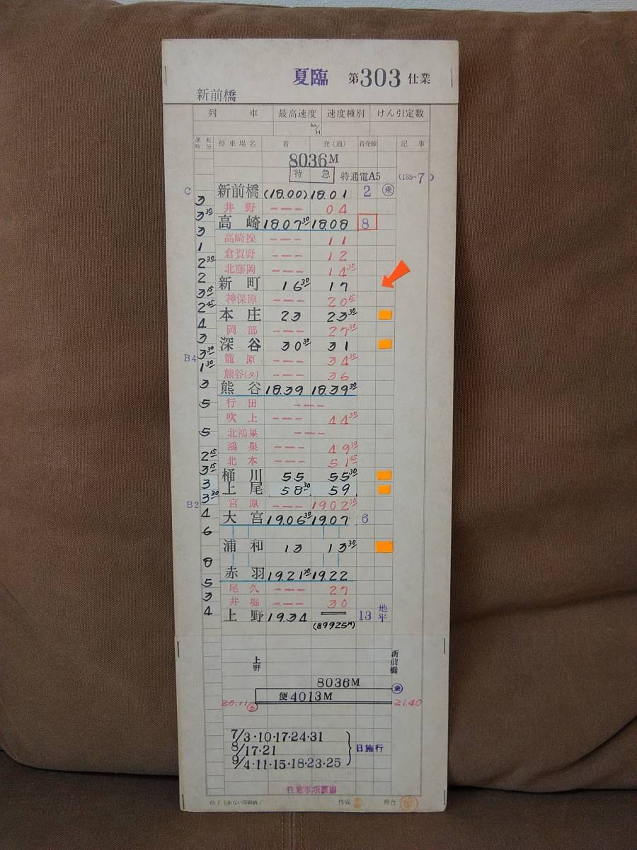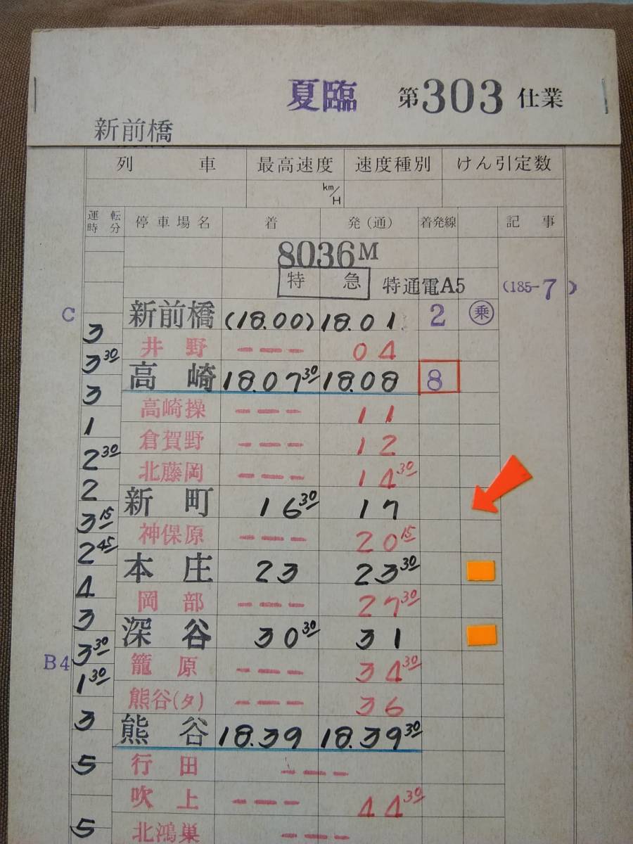 運転士時刻表 スタフ 新前橋電車区 夏臨第303仕業 8036M 新特急 草津 新前橋-上野 185系7両 高崎線 JR東日本 谷川 水上