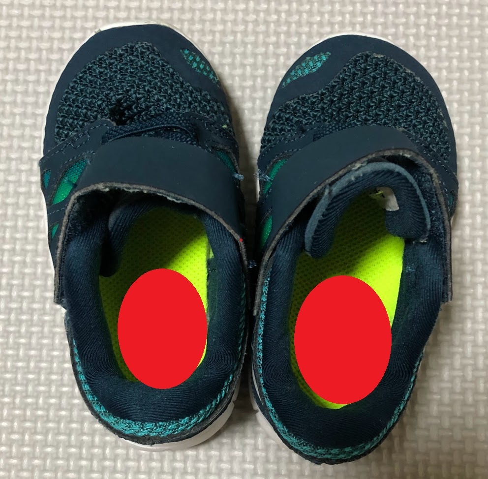 目につく点として、中敷きの使用感(赤丸箇所に氏名の記載があります)