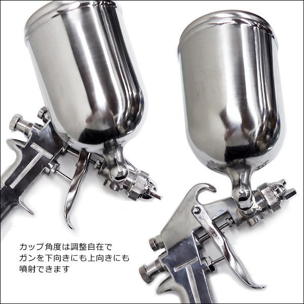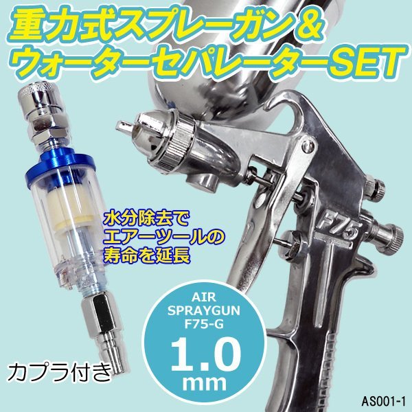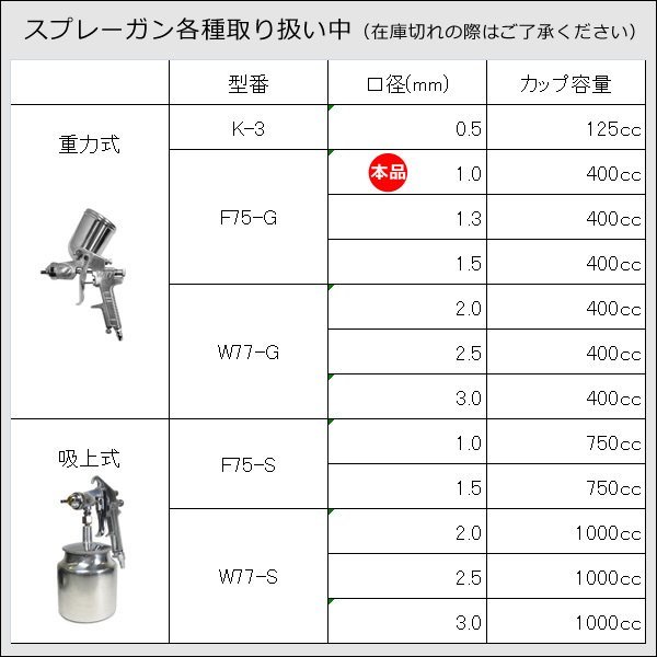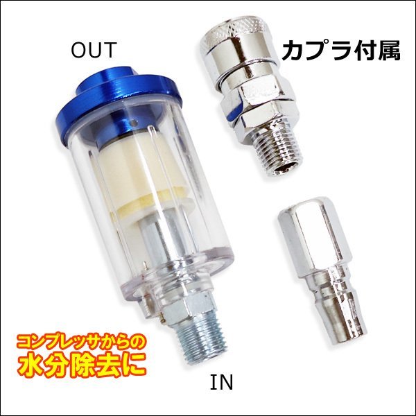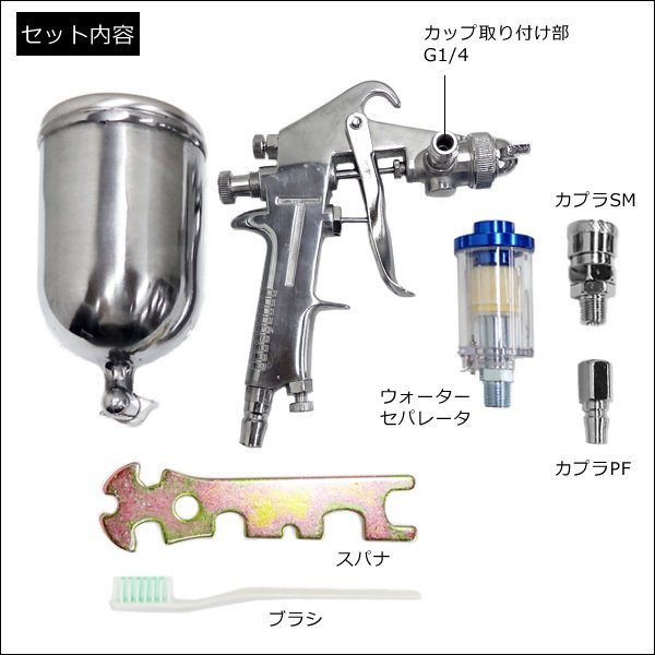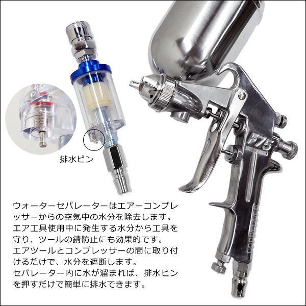 | ■★ウォーターセパレータ付き 重力式エアースプレーガン F75-G 1.0mm 400cc■ ■スプレーガン重力式(上カップ)と簡易型ウオーターセパレーターのセットです。 ■家具や車などのDIY塗装に! 【エアースプレーガン】 ■カップの角度は自在に調整可能 ■塗料噴出量やパターン幅調整可能 ■ノズル口径:1.0mm ■使用空気圧:0.3~0.5Mpa ■吹付距離 :15~20cm ■カップ容量:400ml ■エアインレット:1/4" ■付属品:スパナ/掃除ブラシ ■質量(約)本体328g カップ134g 【ウォーターセパレーター】 ■コンプレッサーの圧縮空気から発生するドレン(水滴)を空気と水に分離、 サビなどを防止し、工具の寿命を延長してくれるエアーツールの必需品です。 ■溜まった水は排水ピンを押すだけで簡単に排水できます。 ■1/4"カプラ付属(PF/SM) ■最大空気圧力:0.78MPa ■質量(約)本体+カプラ2個:180g ※本体オスネジ側(IN)→メスネジ側(OUT)に空気が流れるように、エアースプレーガンなどに直接取り付けてご使用ください。 ※取り扱い説明書等はございません。 ※各種部品やご使用方法等につきましては専門店ではございません為、ご質問頂きましてもお答えが出来ません。 ご不明な点は専門業者様にてご相談ください。 ※輸入品につき傷、汚れ、サビなどが有る場合があります。 ※入荷時期により商品や付属部品のデザイン、色など商品仕様の変更がある場合がございます。 その辺をお許しいただける方のみお買い上げください。 その分、大特価で奉仕いたします。 ◎ 他のサイズ・他の種類・ウォーターセパレーター単品もございます。 | ||