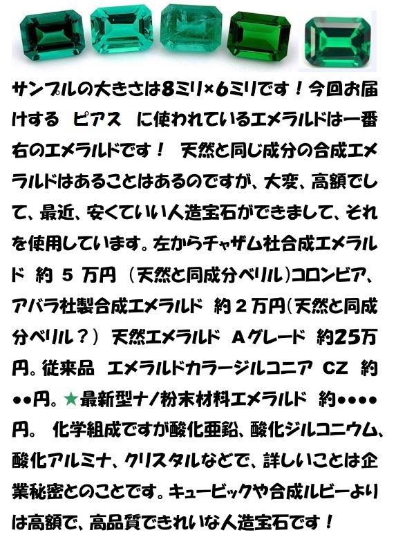 ★こちらは送料を節約し、クリックポスト発送になります。 また、ジュエリーケース無し、プチプチのみの 簡易包装になります、良いものを安く。 ★えらべるオマケ①~⑦プレゼントキャンペーン中! どれか1個お選びいただけます、取引メッセージからご希望の番号をお知らせください。 ★大粒 約2.4カラットの最近発明された 新型の高品質模造エメラルドが2個★ 約8ミリの大粒です!! あなたの 耳を 美しいエメラルドグリーンが 豪華な彩りをあたえてくれるでしょう!! ★天然と同成分のエメラルドはあることはあるのですが 8ミリですと売価が2個で3万円以上になります。 こちらは最近、発明された、新型の模造エメラルドで コロンビア産のエメラルドに似せて作ってあります。 成分はマグネシウム、チタン、亜鉛、ジルコニウム などの微細粉末を高温で焼成しております! 天然と同成分ですと、作成時にベリリウム成分が 毒ガス発生の原因になり危険とのことです。 お手ごろ価格で、エメラルドと同様のかがやき雰囲気 が楽しめます。コロンビア産エメラルドの屈折率 1.58をわずかに上回る屈折率1.62、比重はコロンビア産 が2.69、こちらの模造エメラルドは3.02となっています。 ★コスト的には合成ルビーより高価で合成サファイアよりは 安価となっております、お値段設定、ご理解下さいませ。 それなりに良い人造宝石となっております。 ★こだわりの品質★選び抜かれた材質★ かゆくなりにくい 316サージカルステンレス製 高品質新型エメラルドの大きさ 約8.0ミリ×5.0ミリ 合計4.8カラット(2.4カラット 2個) ピアスの大きさ 約16ミリ×8.2ミリ ピアスの重量 両方で 約2グラム 日本製 | |||