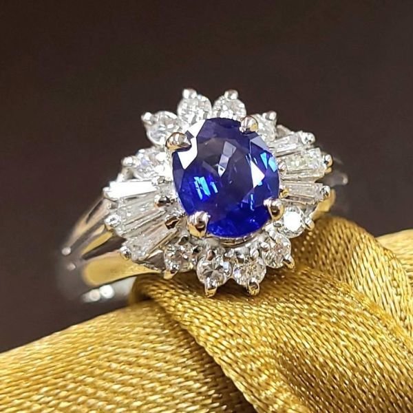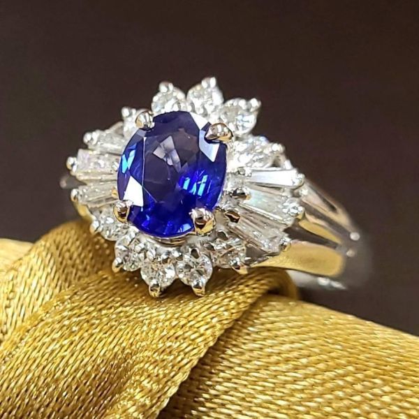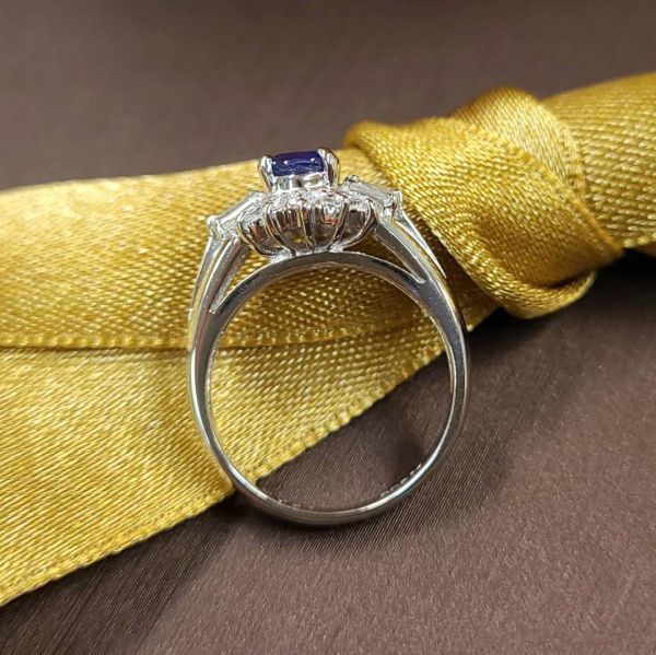 サイドにセットされたテリの良い透明なバゲットカットのダイヤモンドが、サファイアの美しさを一段と引き立てます。