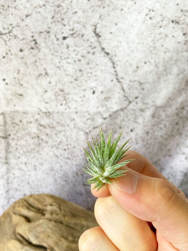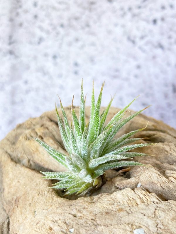 チランジア・イオナンタ・エナノはチランジア・イオナンタの栽培品種の一つで名前の通りあまり大きく成長しない小型種のイオナンタ。 葉は基本種と比べるとやや明るい緑色をしており、基本種同様トリコームも見られ、葉は短めで柔らかいです。 開花期には赤く紅葉し、紫色の筒状の花を咲かせる。 管理は基本種と同様で問題ない、子株をたくさん出し小さいボール状のクランプへと成長し可愛らしい姿を見せてくれる。 画像と同規格サイズのものをお届けになります。 画像撮影日時2023/06/20頃