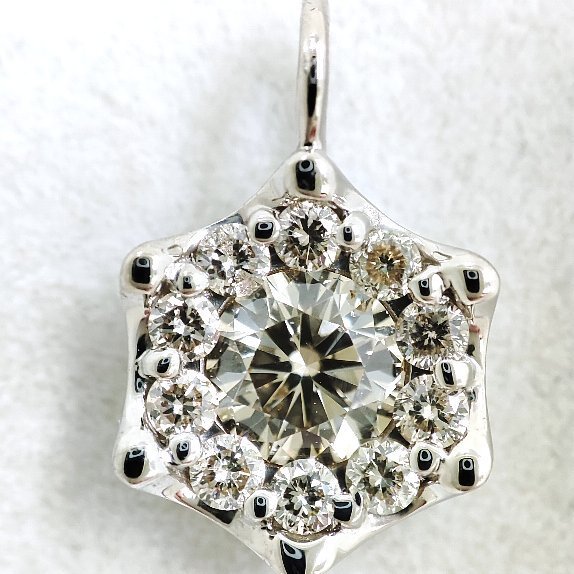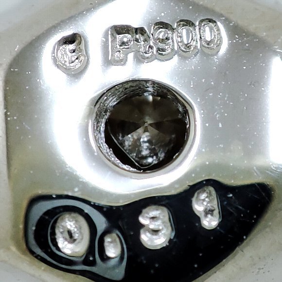 素材は、プラチナ900です。センターにおおよそ 0.2カラット(刻印無し)のダイヤモンドをセットし、その取り巻きに 10ピースのメレダイヤモンドで飾られたペンダントトップですが、取り巻きの脇石でセンター石を石留めすると言う離れ技が確認できます。今のところ、ダイヤモンドに大きなダメージは見られません。センター石のクラリティは主観になりますが、SIクラスになるかと思います。少々のブラウン色が入っておりますが、輝きは強く大変綺麗です。 脇石のダイヤモンドのクラリティは、主観になりますが SIクラスから Iクラスで揃えられています。センター石と同様に少々のお色が入っているのが確認できます。輝きは、まずまずで綺麗です。 |