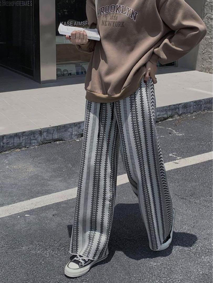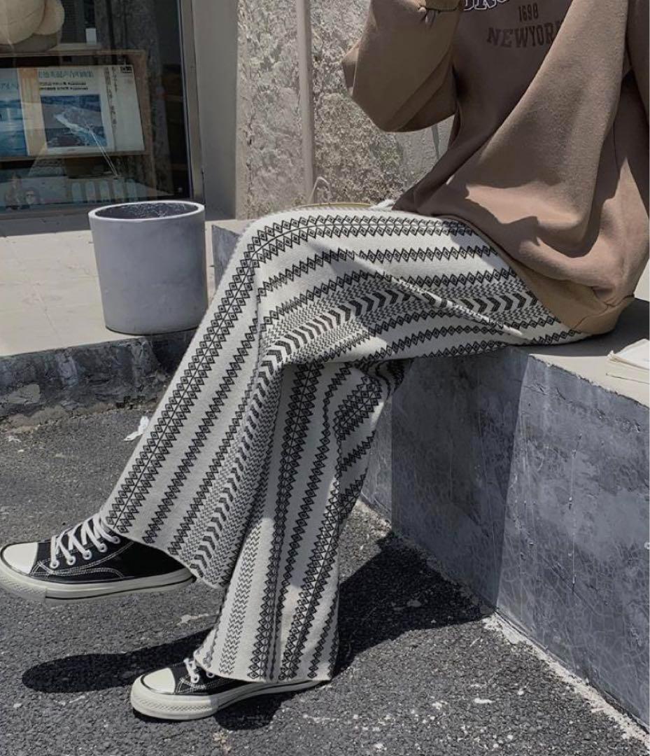 彼女が着用しているストライプのパンツは、20~30代のトレンドを追求するプチプラ好きな方にぴったりのアイテムです。