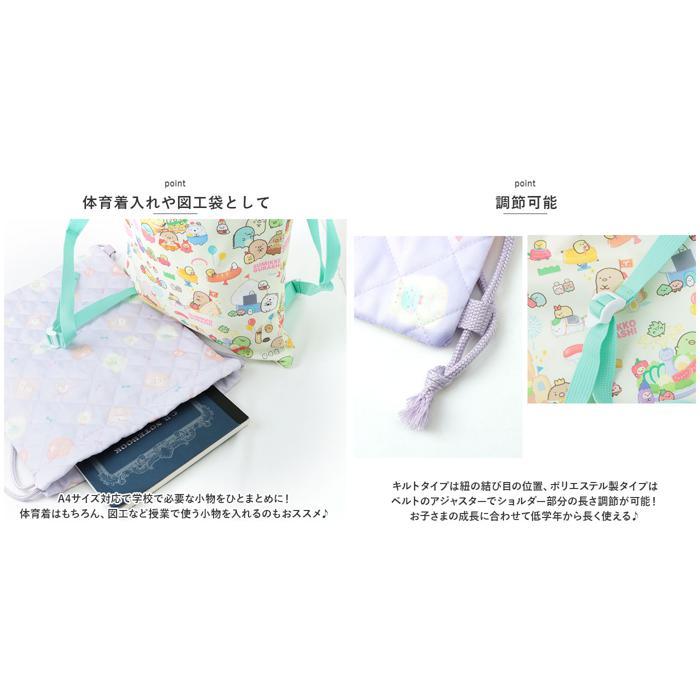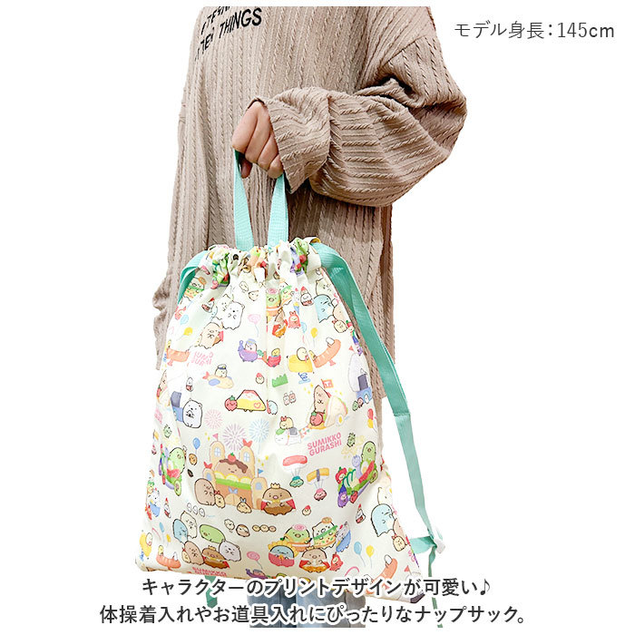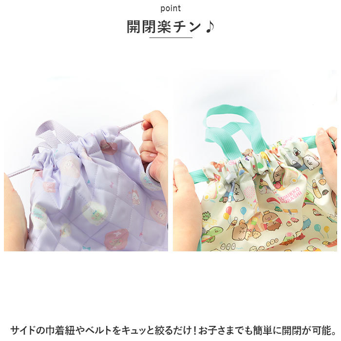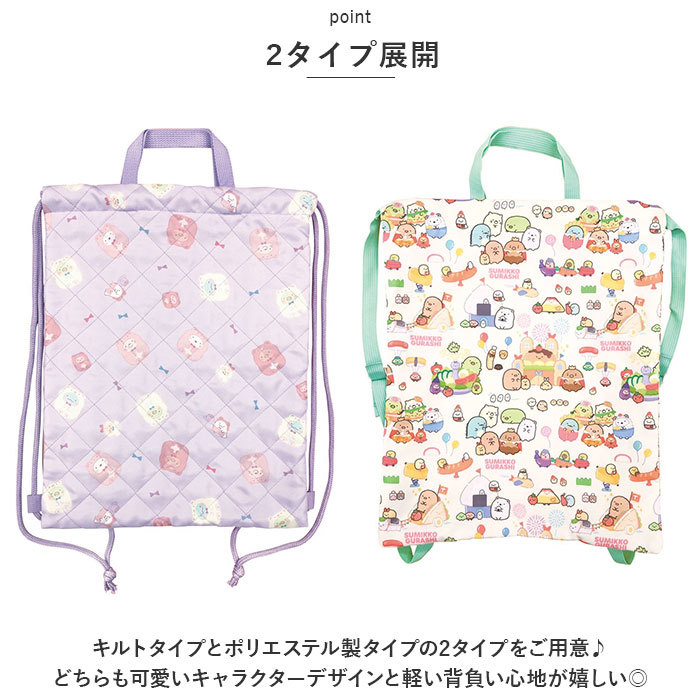商品説明 | ・・キャラクターのプリントデザインが可愛い♪体操着入れやお道具入れにぴったりなナップサック。 ・【開閉楽チン♪】 ・サイドの巾着紐やベルトをキュッと絞るだけ!お子さまでも簡単に開閉が可能。 ・【2タイプ展開】 ・キルトタイプとポリエステル製タイプの2タイプをご用意♪どちらも可愛いキャラクターデザインと軽い背負い心地が嬉しい◎ ・【体育着入れや図工袋として】 ・A4サイズ対応で学校で必要な小物をひとまとめに!体育着はもちろん、図工など授業で使う小物を入れるのもおススメ♪ ・【調節可能】 ・キルトタイプは紐の結び目の位置、ポリエステル製タイプはベルトのアジャスターでショルダー部分の長さ調節が可能!お子さまの成長に合わせて低学年から長く使える♪ ・【持ち手付き】 ・持ち手付きなので、手提げとしても使用OK。 ・【はっ水加工】 ・ポリエステル製タイプは生地表面にはっ水加工施し、雨の日の通学用にも◎汚れにもお手入れも楽チン。(※キルトタイプにはっ水機能はございません。) ・【幅広いシーンで活躍☆】 ・通学のサブバッグとして使うのはもちろん、習い事やお出かけ時のカバンとして使うのもGOOD!大好きなキャラクターといつも一緒に外出を楽しめるアイテム♪ |