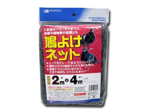 ・ 4989156003034・色:グレー・サイズ:2m×4m・目合:25mm菱目・鳩よけ用ネットです。・長さ方向両側ロープ入りで、簡単に取り付けできます。●強力なナイロン撚り糸で、鳩をシャットアウトします。●【用途】●鳩よけ用ネット。●【機能・特徴】●ベランダでの鳩よけや、菜園のカラス対策に使用できます。●長さ方向両側ロープ入りで、簡単に取り付けできます。●シックなグレーなので目立ちにくいです。●菱型25mmの網目で小さな鳥にも安心です。●高級ナイロンのより糸だから、丈夫で長持ち、カラスにも安心です。●【仕様】●サイズ:2m×4m。●色:グレ-。●目合:25mm菱目。●長さ方向両側ロープ入。●【材質】●ナイロン。●【商品サイズ】幅210×高さ281×奥行31mm 重量385g●商品コード:4989156003034●JANコード:4989156003034●ブランド名:日本マタイ●商品名:鳩よけネット グレー●規格:2MX4M