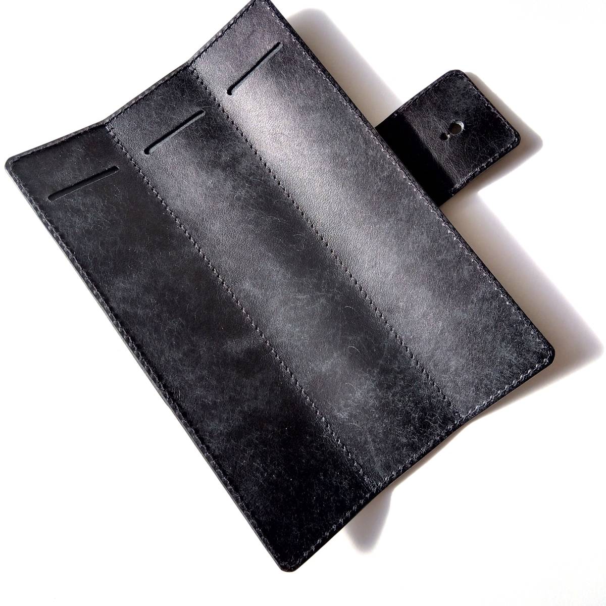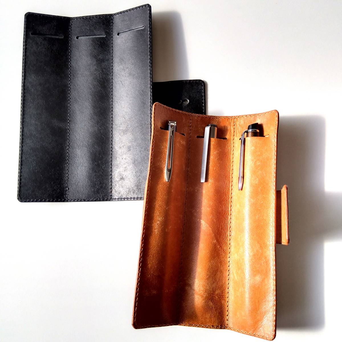 1本用の「極薄革のペンシース」を3連にした形で、巻くと三角形のような形になるので自立させることもできます。