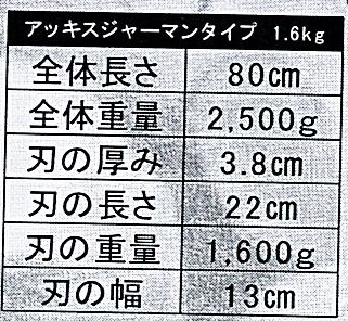 仕様・・ 1600g 柄付き 長さ80cm 刃巾13cm 全重量2500g