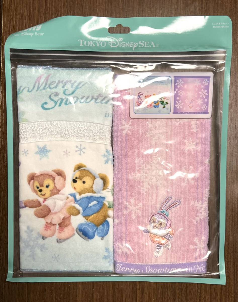 TDS Snow time ダッフィー&シェリーメイ ステラルー ミニタオルセットです。1枚はダッフィー&シェリーメイ&ジェラトーニがスケートをしてる可愛いデザイン。2枚目はステラルの刺繍が可愛いピンク色に銀糸のキラキラグッズ。タオルのサイズは約25×25cm。レターパックはサイズの関係で商品のビニールの端を一部折って入れれば対応可能です。ご了承の上ご指定ください。普段使いに可愛い小物はいかがですか?