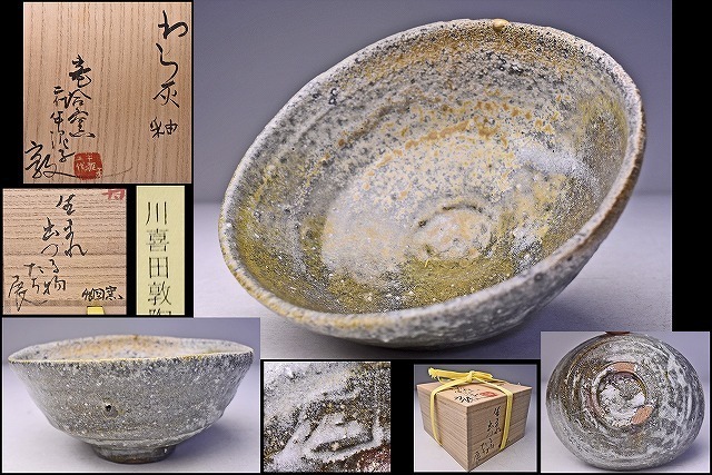 川喜田半泥子 2代 ( 川喜田敦 )★ わら灰釉 茶碗 ★ 共箱 栞 ★ 生まれ出つる物たち展 出展作 銘:『 古希の春 』★ 景色抜群の逸品 ★