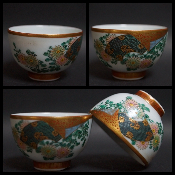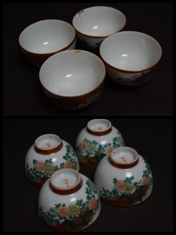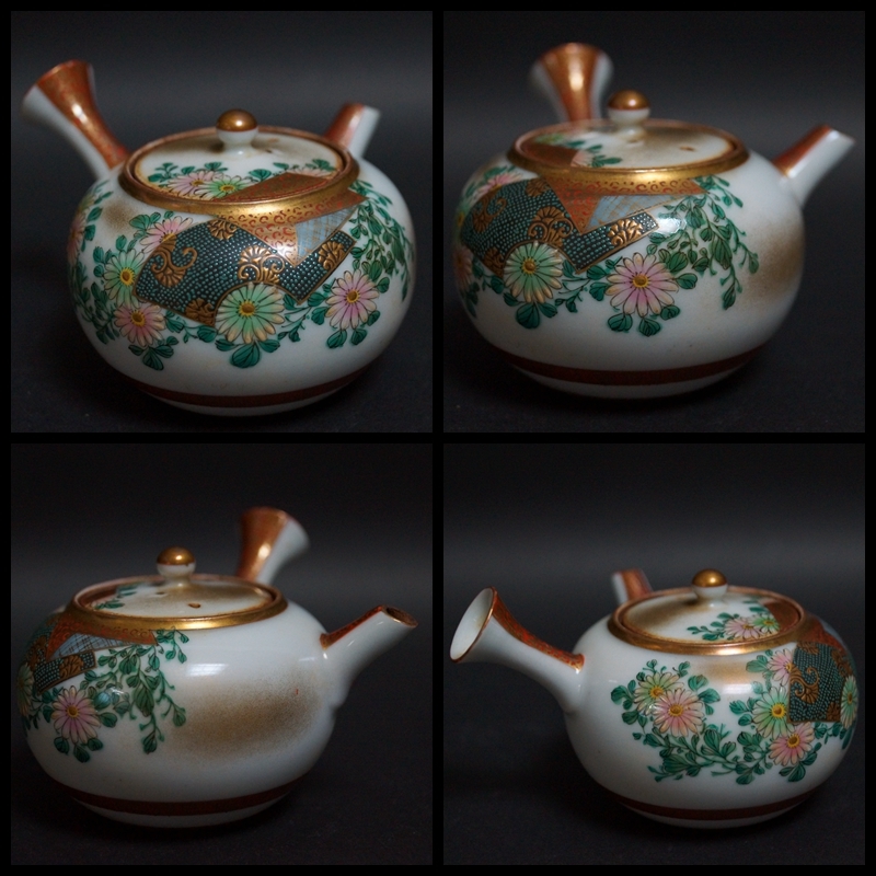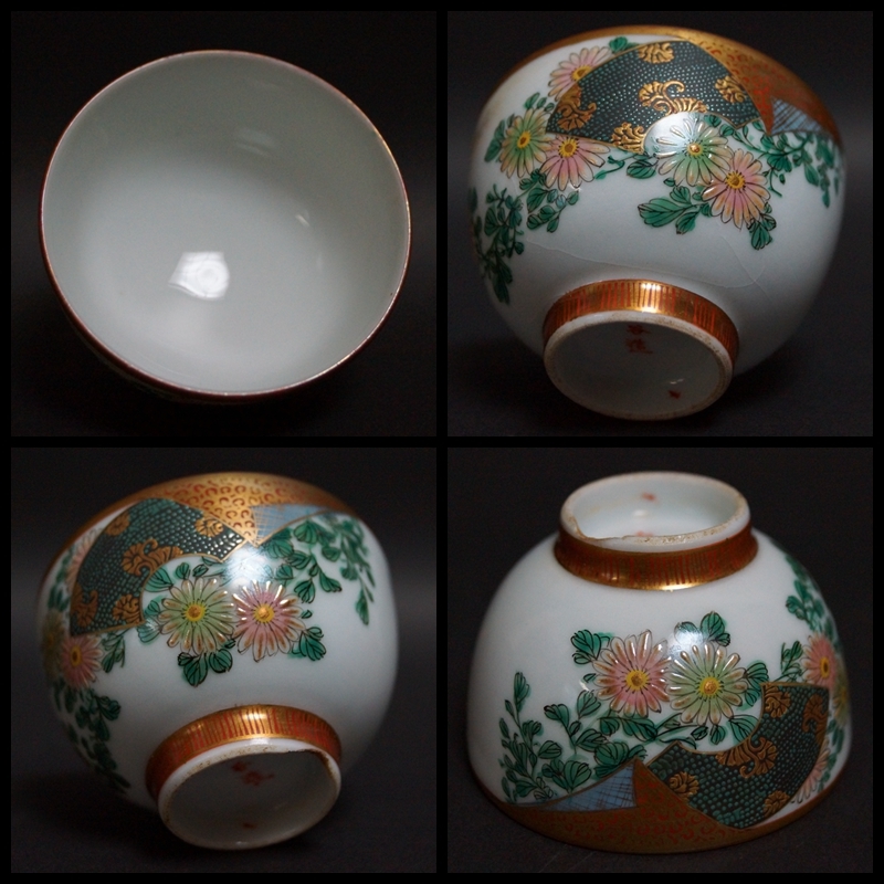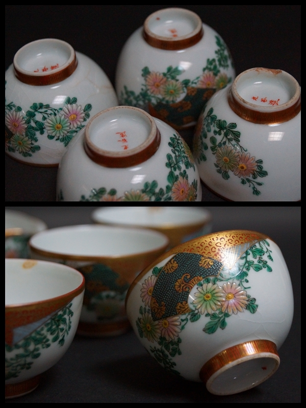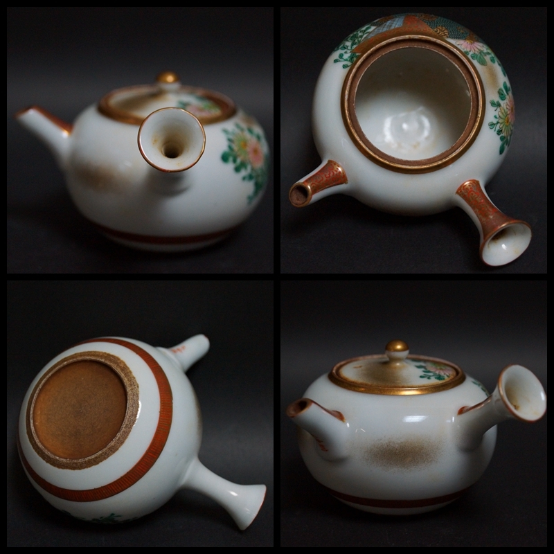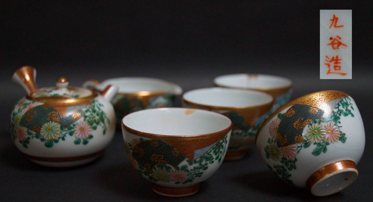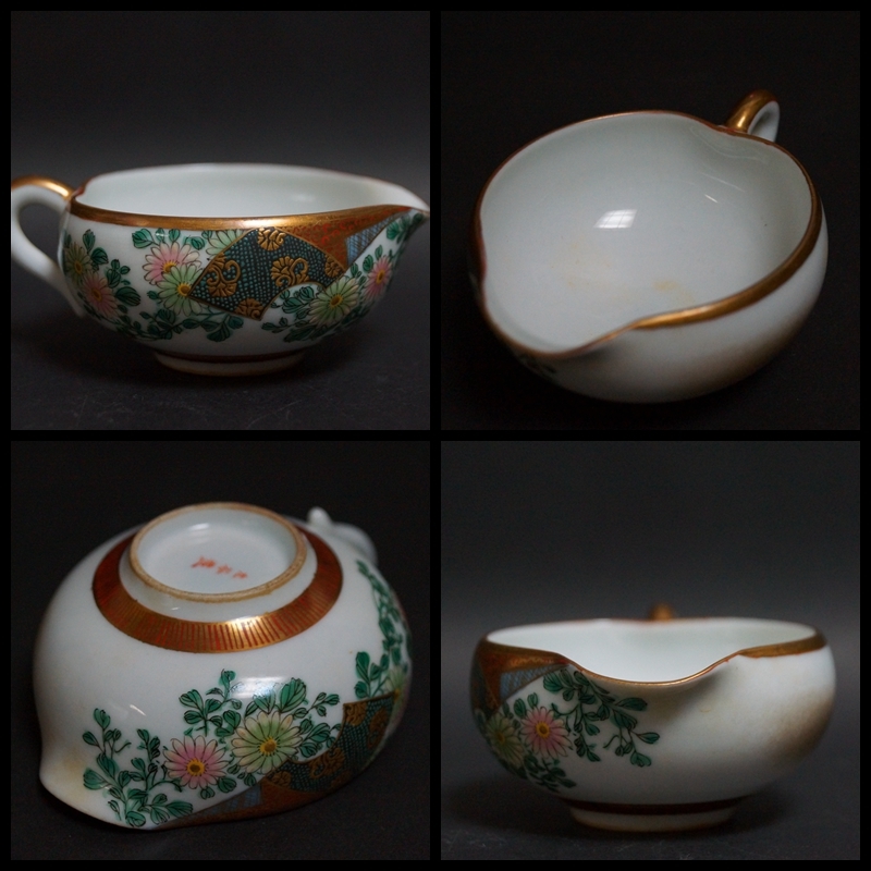 明治期 九谷焼 手描青粒金彩色絵『菊唐草文』横手急須/湯冷まし/煎茶碗(四客)煎茶器セット煎茶道具★時代物★5D0404 サイズ(約): 急須:幅6.5cm、注ぎ口含む長さ7.8cm、高さ5.5cm、重さ73g 湯冷まし:長さ8.5㎝、最大幅6㎝、高さ3.2㎝、重さ43g 煎茶碗:径5.8㎝、高さ4㎝、重さ40g ※写真通り経年によりかけ傷あり |