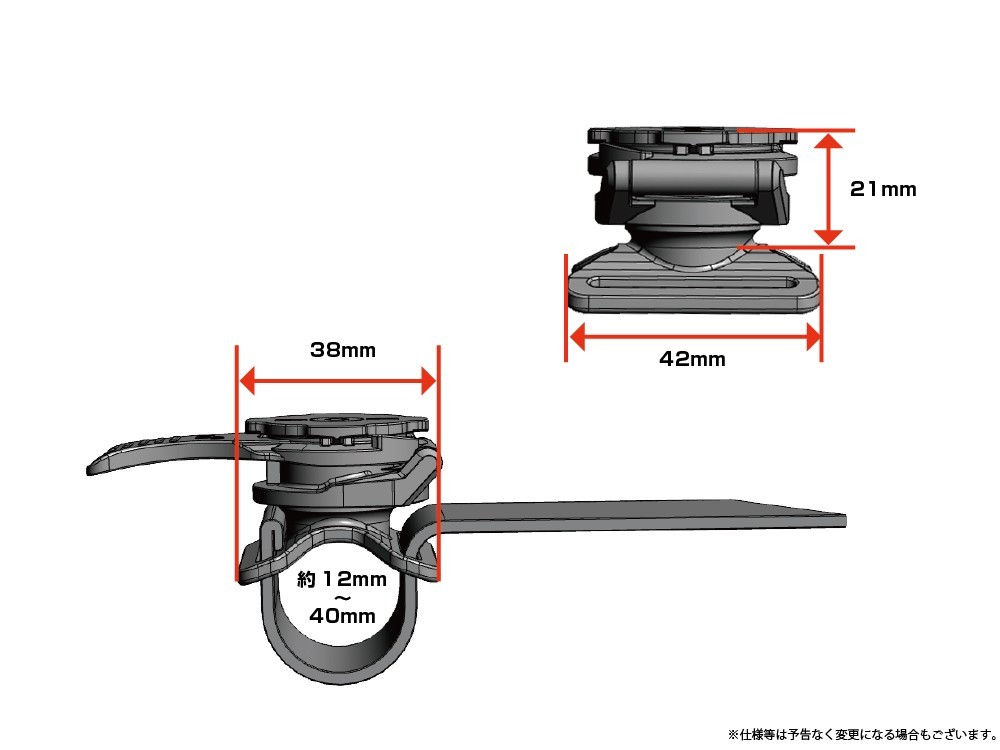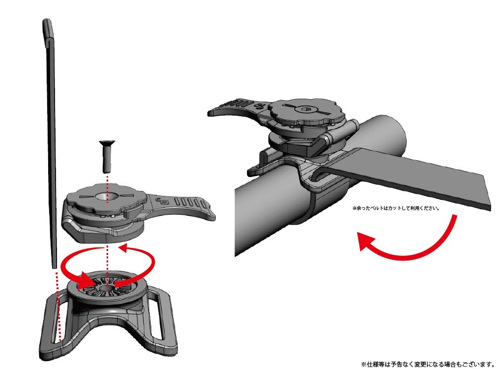 簡単に取り外しの出来る2種類のサイズのマジックテープを使用したバンドとタイラップで固定が可能な汎用タイプのバーマウント