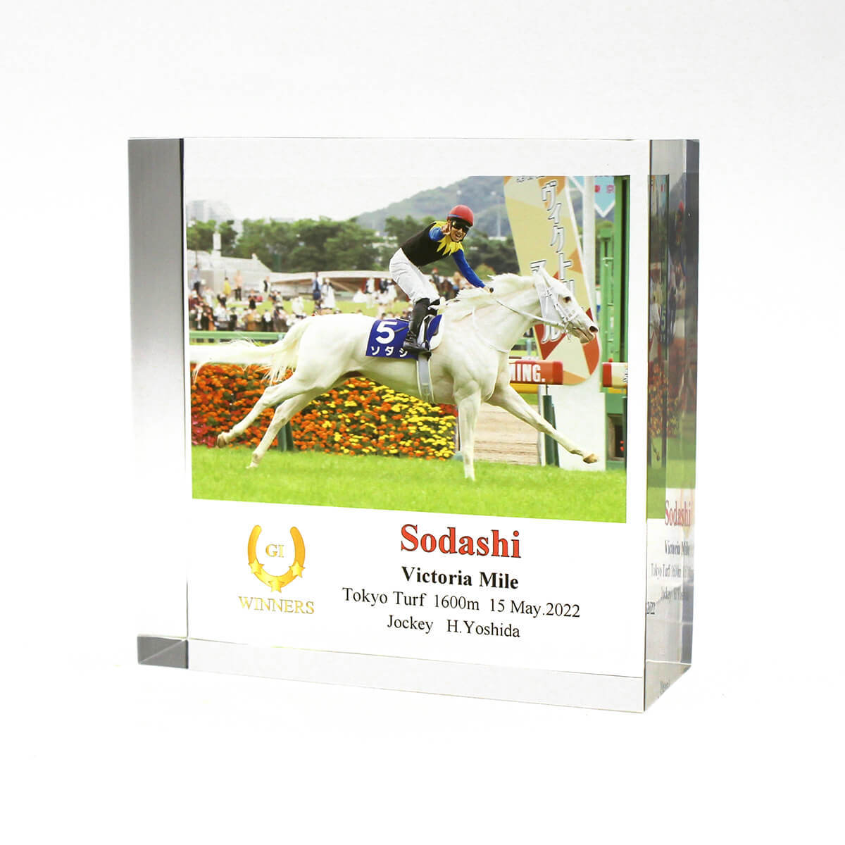 匿名送料無料 ☆白毛馬 ヴィクトリアマイル 優勝記念★ソダシ Sodashi アクリル製 置物 縦8×横8㎝ 吉田隼人 JRA 東京競馬場 即決!