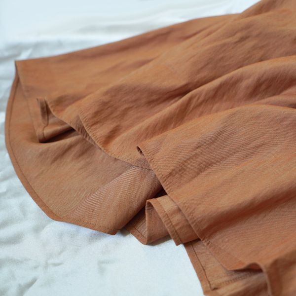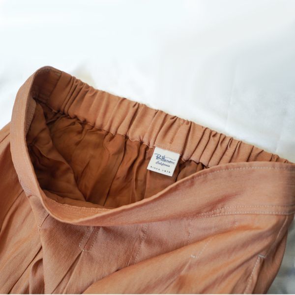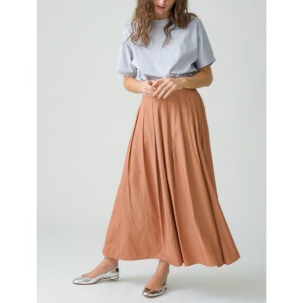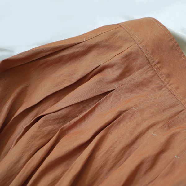 | コメント | 軽やかなポリエステル素材のロングスカート タックをふんだんに入れてプリーツのように華やかに見せています。フロントは綺麗にベルト仕様ですが、後ろはゴムで履きやいのもポイントです。 |