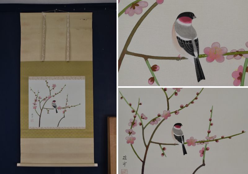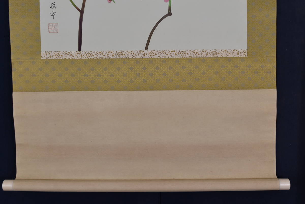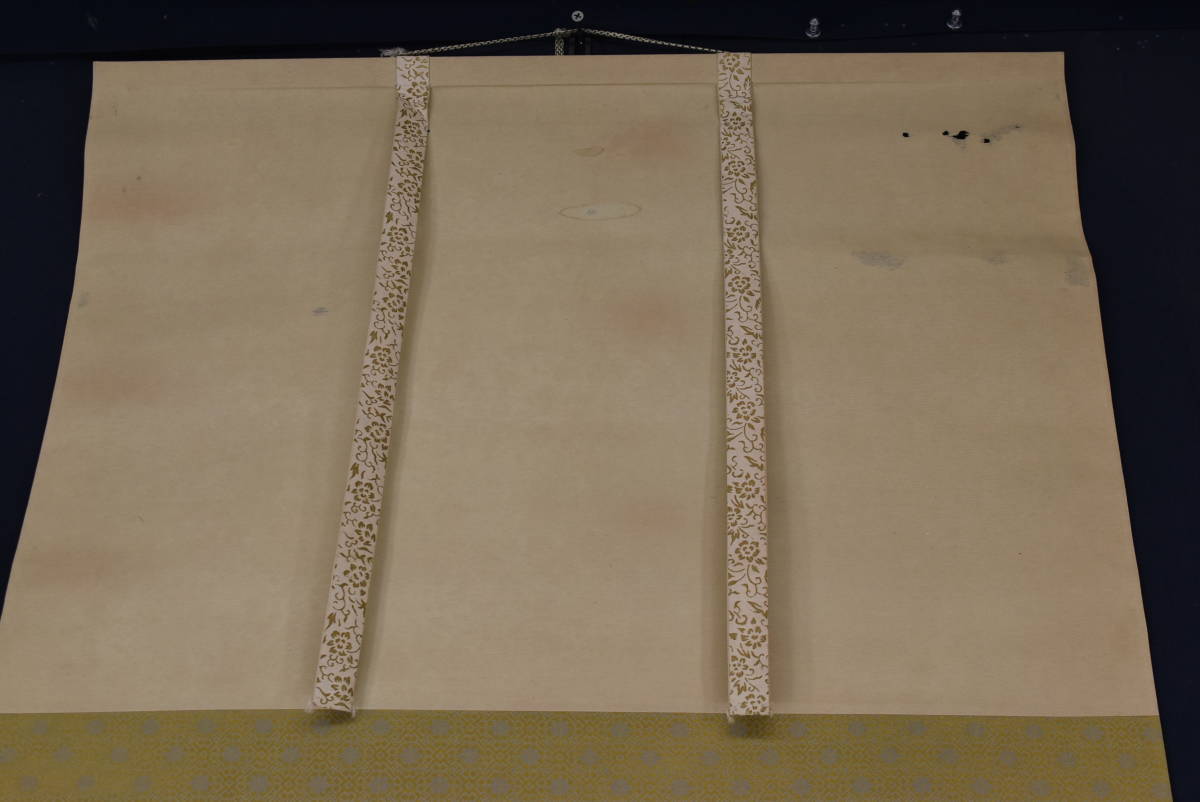 【作品状態】 本紙は絹本肉筆です。本紙は概ね良好です。表装は薄汚れ、天地に多数の汚れシミ、数ヶ所の大きな水シミ、虫穴、多数の虫ナメなどあります。 天の状態は悪いです。巻裏に多数の虫ナメあります。