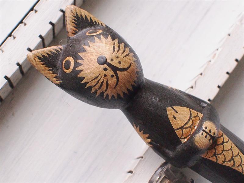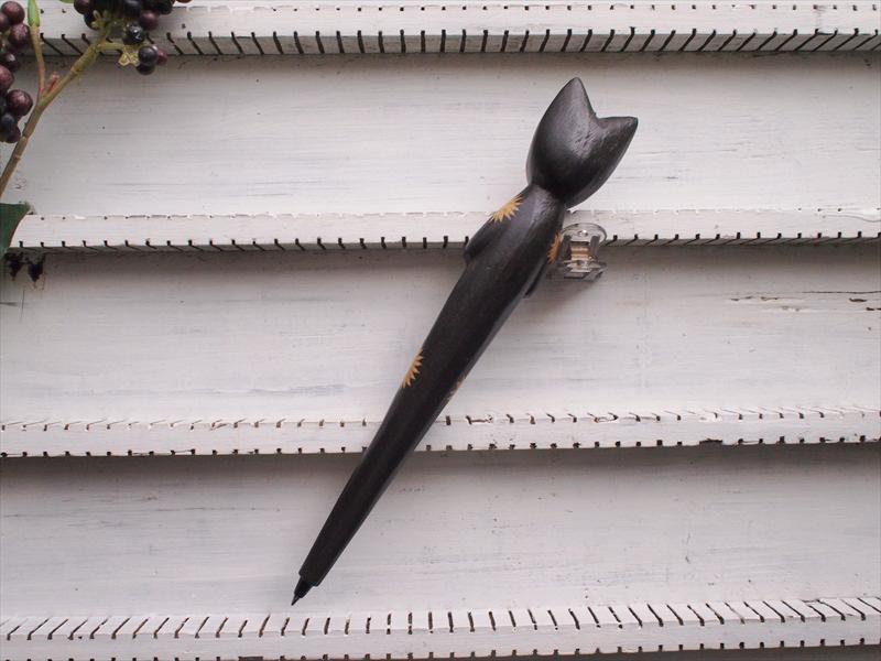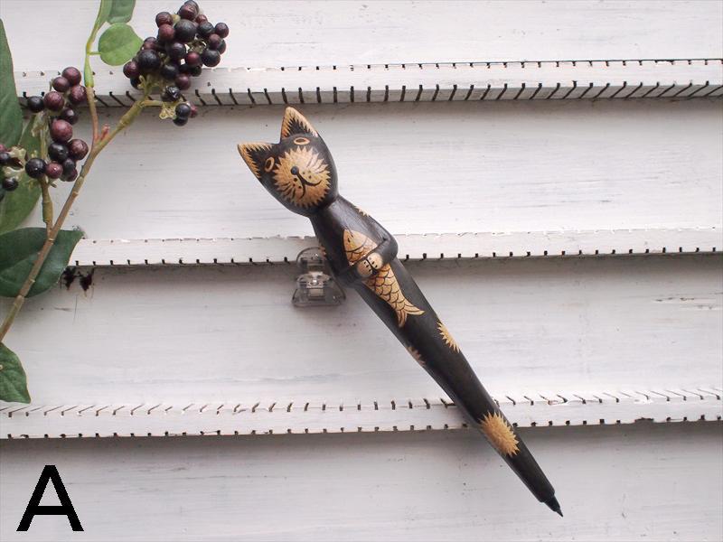 バリ島面白木彫り雑貨*魚を抱えたネコボールペン・黒・A☆CHA-CHA SHOPオリジナルインテリア