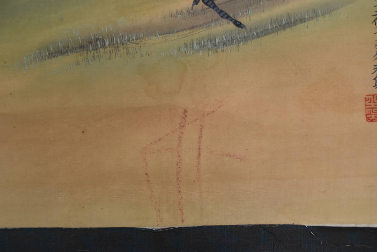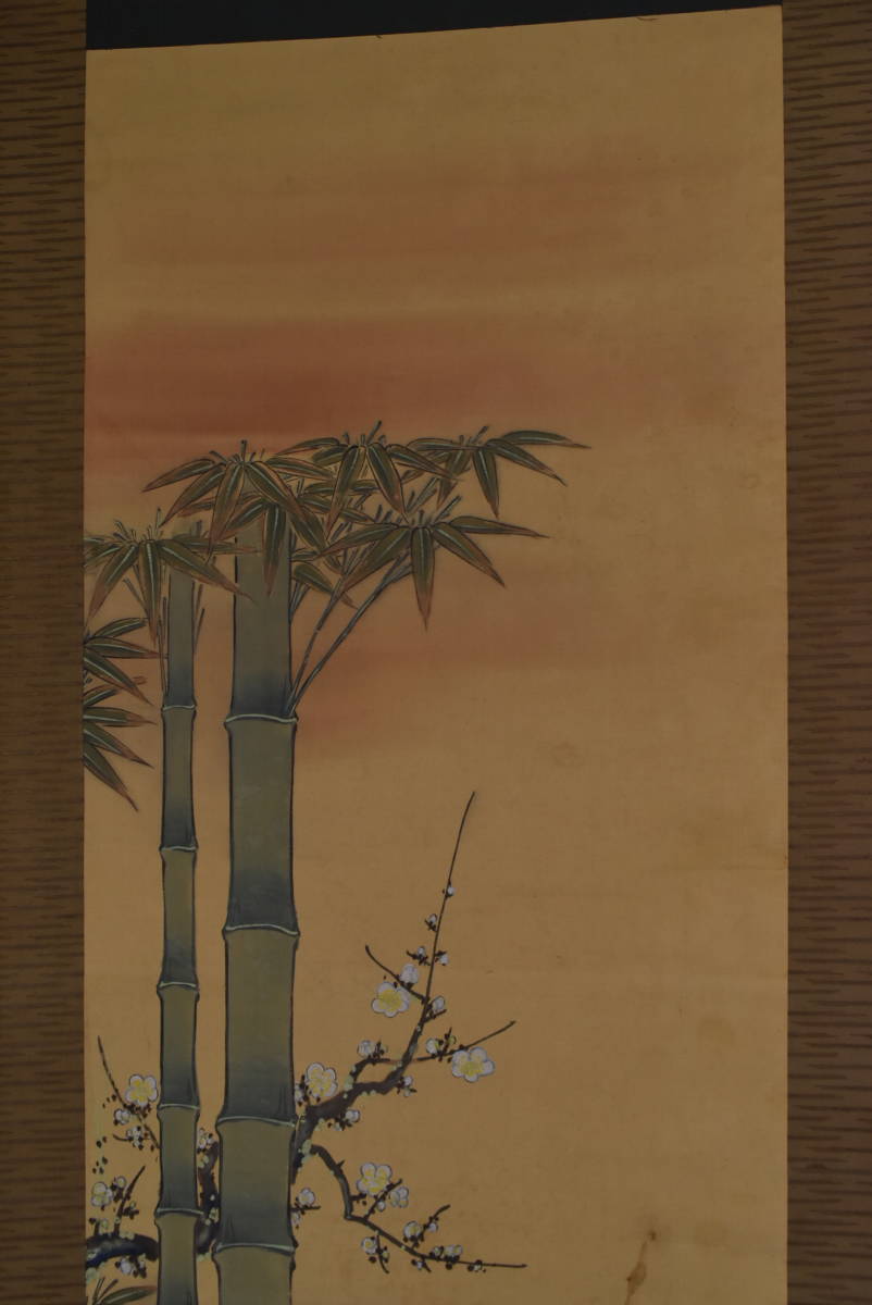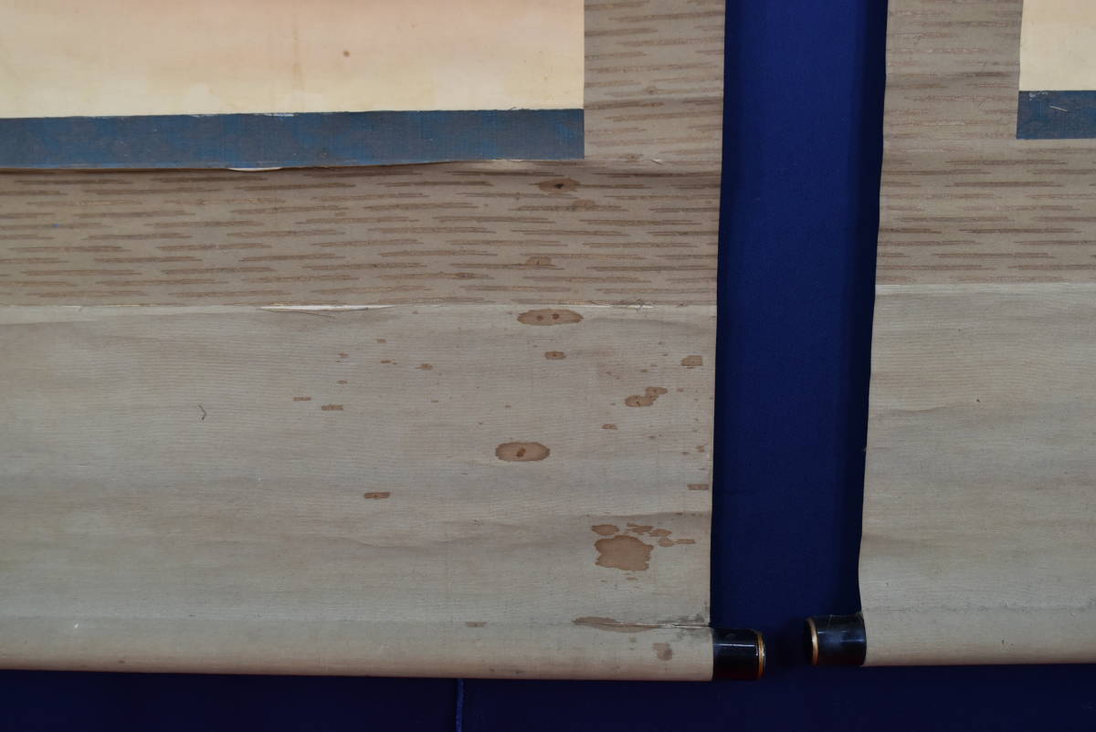 【作品状態】 本紙は絖本肉筆です。本紙は薄汚れ、多数の汚れシミあります。表装は時代感あり、汚れシミ、大きな耳切れ、折れ、巻シワあります。