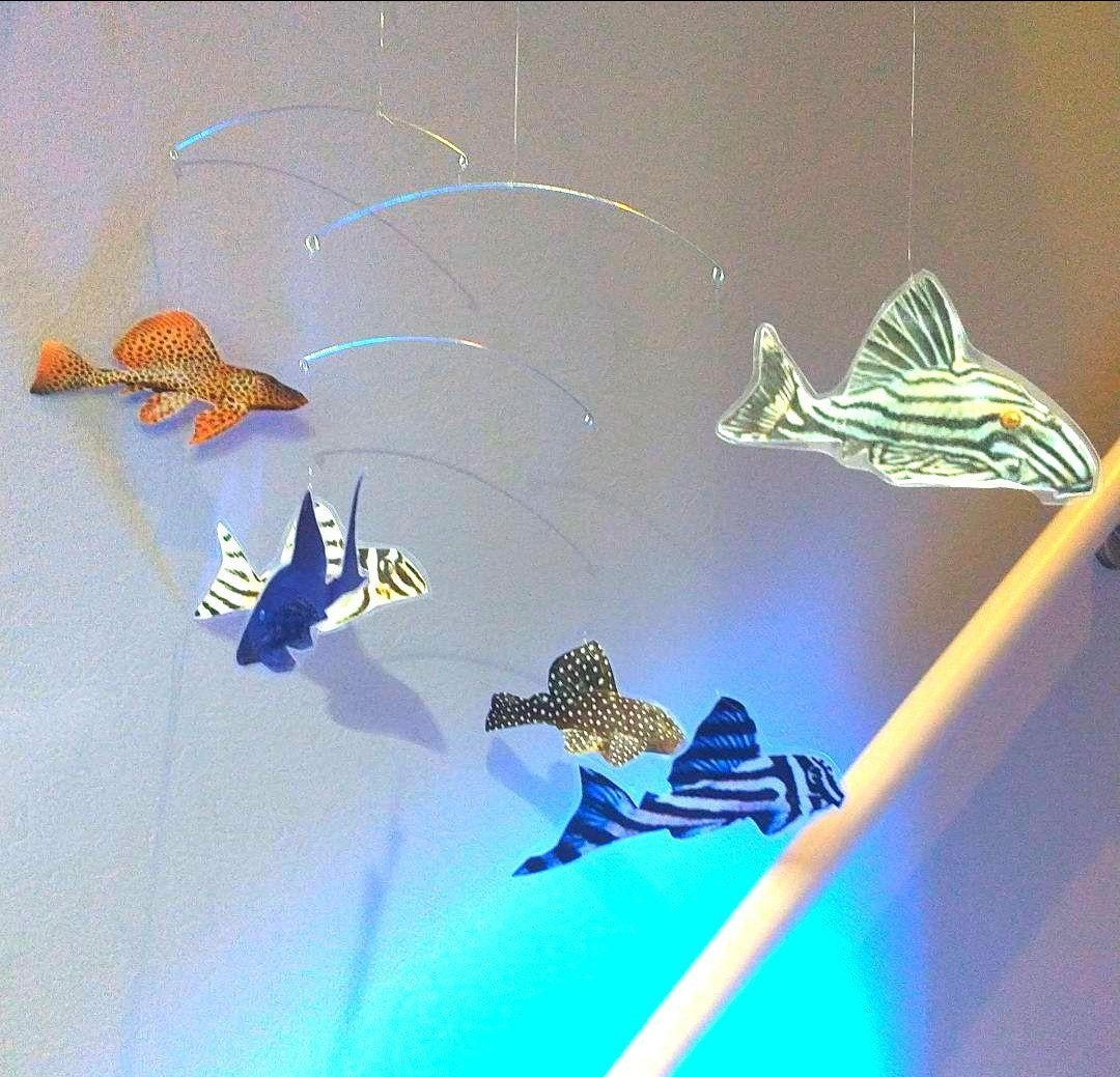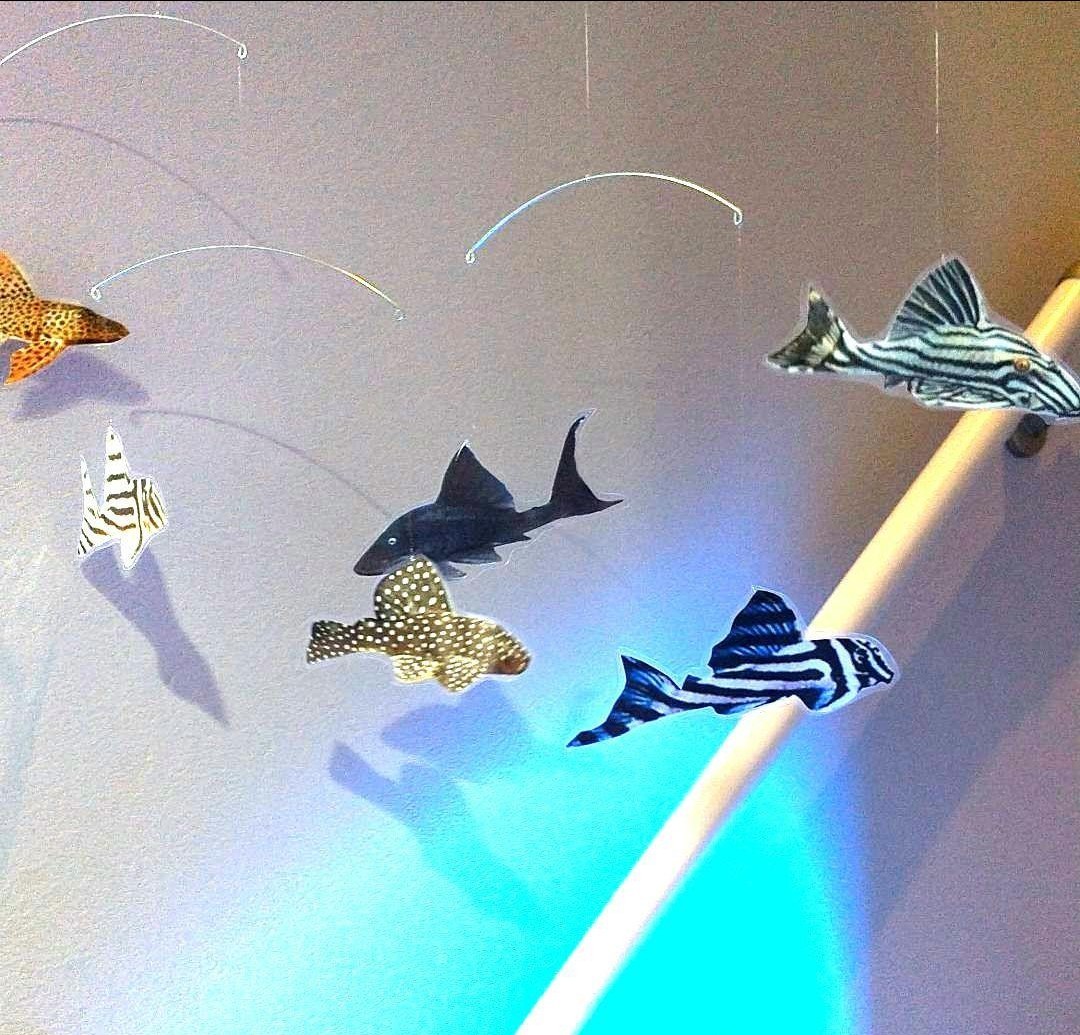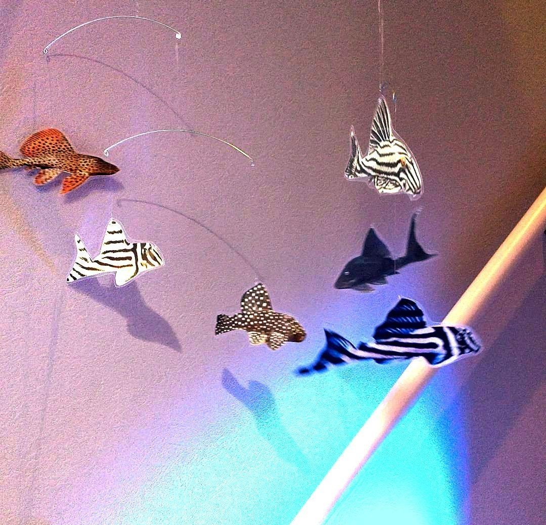 モビールとは動く彫刻。熱帯魚を糸や針金でつるし、それらがバランスを保ちながら、わずかな風で微妙に動くようにしたものです(*^^*)