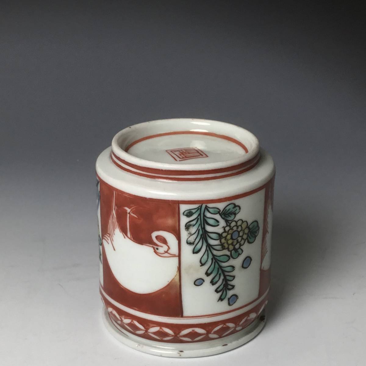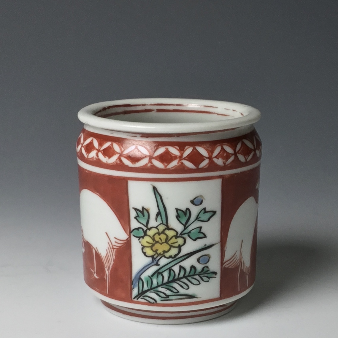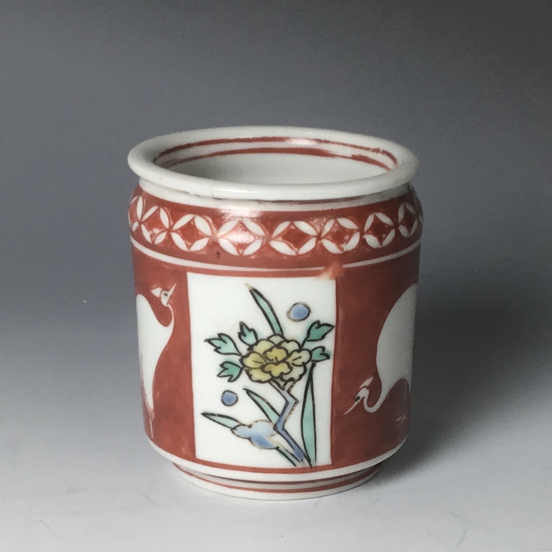 (翔)古伊万里 色絵 江戸後期 文化文政期 鷺 白抜 牡丹 のぞき 猪口 珍しい形 裏銘 ⑤ 1800年代前後